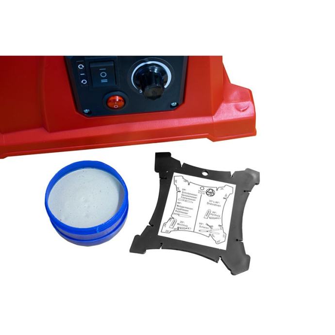 - brusni kamen od aluminijevog oksida prolazi kroz lokvu vode radi hlađenja obratka i sprečava pregrijavanje- konstantna i niska brzina osigurava siguran rad bez iskrenja- optimalno prilagođen za "uradi sam", ali i za komercijalnu upotrebu- bezstepena brzina podesiva potenciometrom- podesivi smjer brušenja CW ili CCWuključeno u isporuku: brusni kamen od aluminijskog oksida K220, kožni brusni točak, univerzalni držač, držač alata, spremnik vode, kutni predložak, pasta za brušenje TEHNIČKI DETALJI: