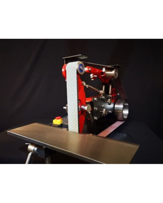 Tračna brusilica s podesivom metalnom radnom površinom i konstantnom brzinom brušenja. Mogućnost vertikalnog i vodoravnog brušenja.