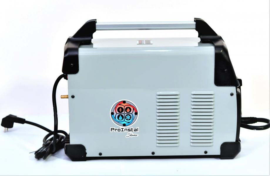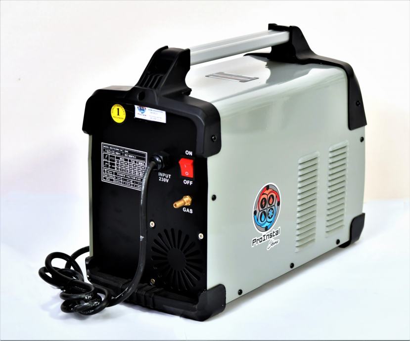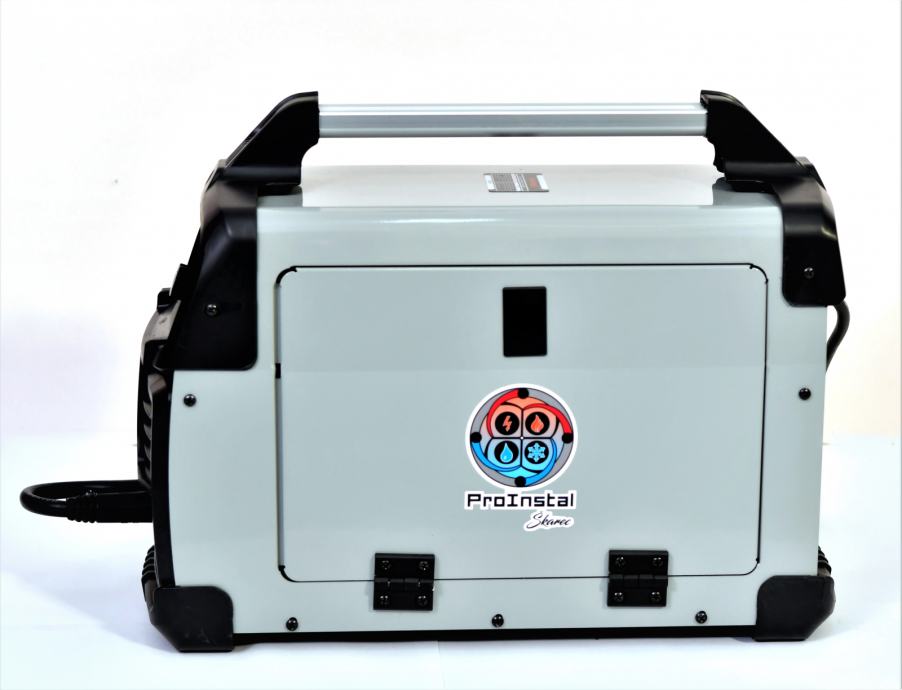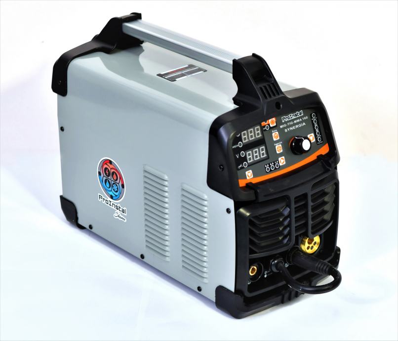 Aparat za zavarivanje PROINSTAL MIG TIG MMA SYNERGIA je poluautomatski aparat za zavarivanje niskougljičnog, niskolegiranog čelika (MAG), legiranog čelika (MIG), aluminijskih legura itd. Prikladan za zavarivanja na terenu , bravarskim radionicama, servisnim radionicama, industrijskim radionicama, itd. Zahvaljujući sinergističkim postavkama, uređaj je vrlo jednostavan za uporabu i može ga koristiti zavarivač sa minimalnim iskustvom. Uređaj se može koristiti za MMA zavarivanje pomoću elektroda kao i za TIG postupak. Izvor napajanja izgrađen je na IGBT tranzistorima poznate marke TOSHIBA. Zahvaljujući korištenju suvremene inverterske tehnologije usprkos malim dimenzijama, ovaj aparat omogućuje zavarivanje sa MIG / MAG / FCAW / TIG postupcima strujom do 160 ampera i MMA postupkom do 150 ampera. Aparat je opremljen EURO priključkom, najčešće korištenim priključkom.