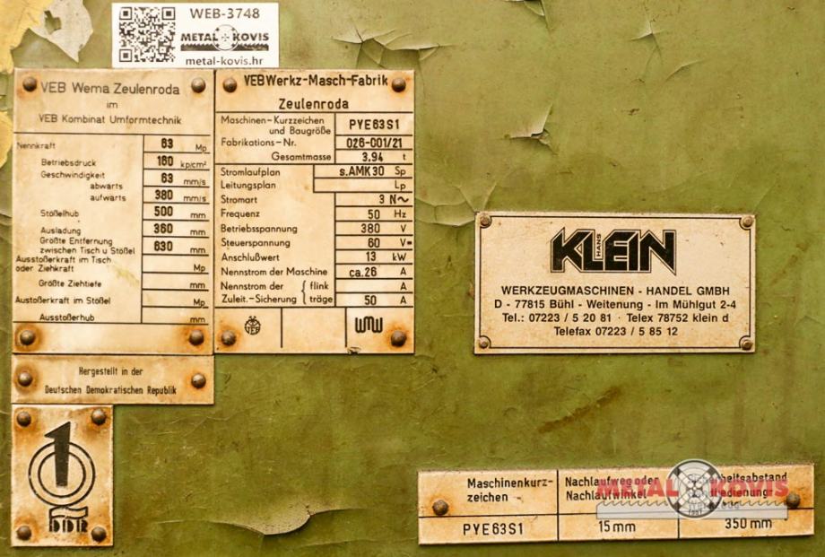 Hidraulična preša VEB Zeulenroda PYE 63 S1, WMW