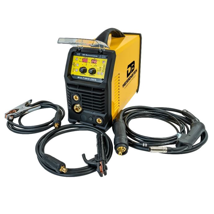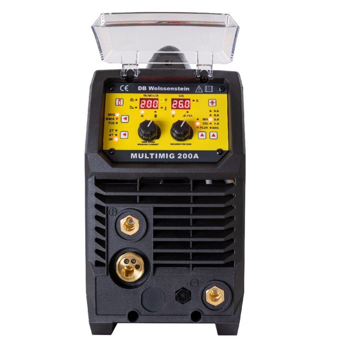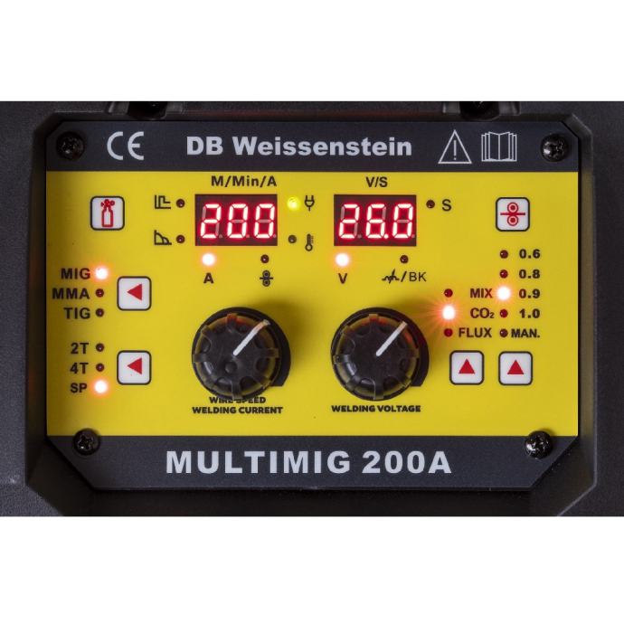 Multimig 200 je mali kompaktni inverterski aparat za zavarivanje za mobilnu upotrebu, sa aparatom za zavarivanje možete zavarivati MIG MAG TIG WIG i ARC MMA elektrode. Sa snažnim i kompaktnim uređajem možete obrađivati kolute žice promjera do 200 mm (5 kg). Uređaj omogućuje MIG/MAG zavarivanje između 40 i 200 ampera, sa ili bez plina. Zavarivanje bez plina zahtijeva punjeno žicu FLUX. Stroj je kontinuirano podesiv, po izboru ručno ili sinergijski. Zahvaljujući funkciji točkastog zavarivanja, uređaj je također vrlo prikladan u automobilskom sektoru za obradu lima, karoserije i konstrukcije vozila. Aparat za zavarivanje ima zubčasti pogon za dovod žice, što omogućuje korištenje dužih gorionika. Uređaj ima brzu spojku za plinski priključak koja ima automatsko isključivanje plina. Omogućuje brzo i sigurno spajanje i odvajanje pod pritiskom. Nema više gubitaka plina. Aparat za varenje svih vrsta čelika, aluminija, legure aluminija i inoxa.