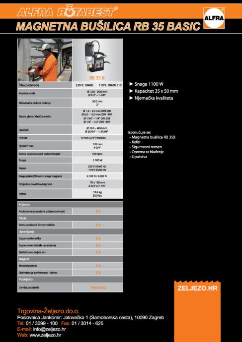 Magnetna bušilica njemačkog proizvođača tvrtke Alfra, model RB 35 B kapaciteta bušenja do 35 mm promjera / 50 mm dubine, 1100w.
