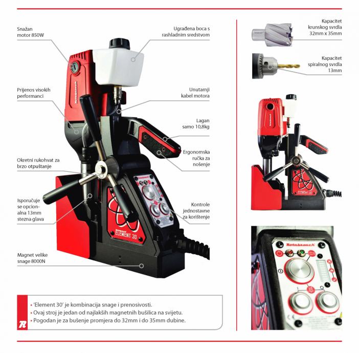 Element 30 kao i sve magnetne bušilice iz te serije nema energetskih kablova s vanjske strane integrirani su u tijelu bušilice što daje sigurnost i duži rad.