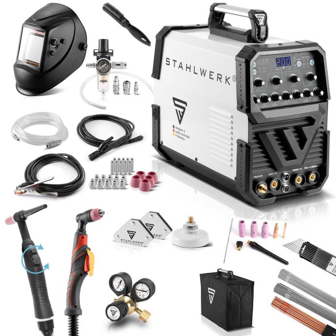 STAHLWERK AC/DC TIG 200 Puls CUT ST višenamjenski je aparat za TIG zavarivanje s funkcijom plazma rezanja i MMA ili funkcijom zavarivanja elektrodom. Jedna od mnogih prednosti ovog kombiniranog aparata za zavarivanje 3-u-1 je njegov kompaktni dizajn i mala težina od samo 13 kg. S funkcijom rezanja plazmom, materijal debljine do 12 mm može se rezati na 50 ampera. AC/DC TIG 200 Puls CUT ST ima opsežnu pulsnu funkciju, koja između ostalog olakšava zavarivanje tankih limova. Parametri kao što su pulsna struja, pulsna frekvencija, dugi i kratki puls mogu se lako podesiti. Daljinski upravljiva kontrola struje na plameniku za zavarivanje ili nožnoj papučici (dostupna kao opcija) nudi vam prednost da možete regulirati struju i tijekom procesa zavarivanja. Najsuvremenija IGBT tehnologija omogućuje maksimalne performanse kod TIG i MMA zavarivanja, kao i rezanja plazmom. Kombinirani aparat za zavarivanje AC/DC TIG 200 Puls CUT ST isporučuje se s opsežnim paketom dodatne opreme.