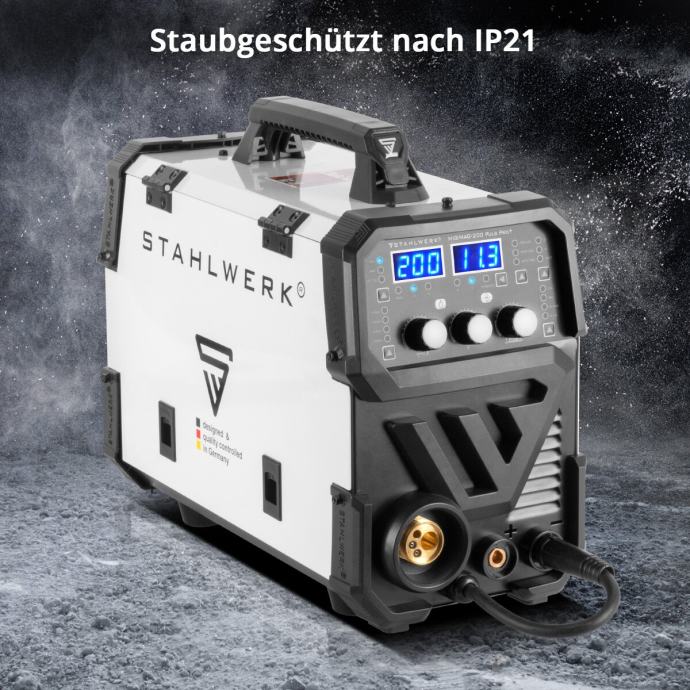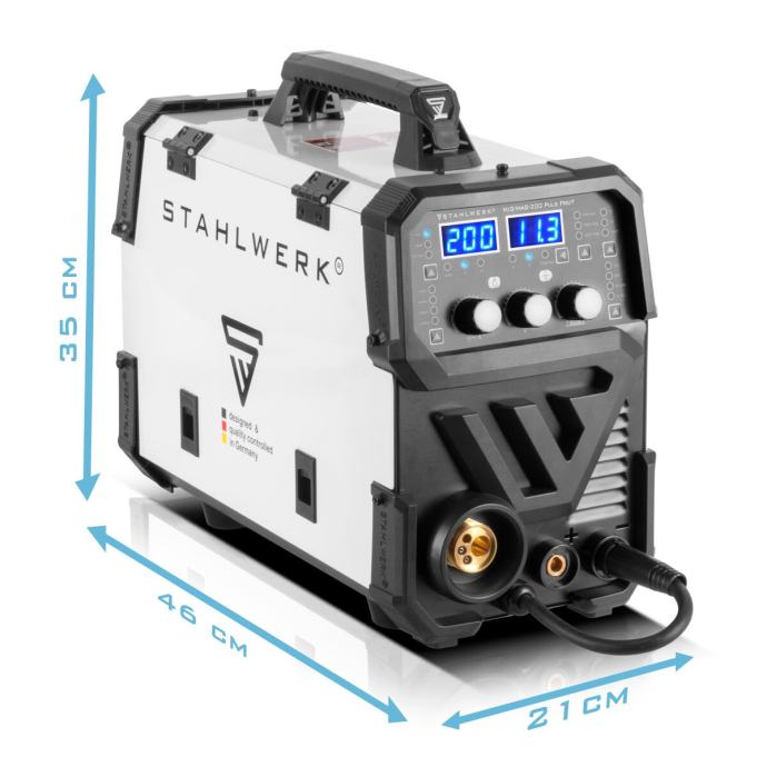 STAHLWERK MIG MAG 200 Puls Pro Plus je potpuno sinergijski 5 u 1 IGBT aparat za zavarivanje istosmjernom strujom sa stvarnih 200 ampera. Kombinirani aparat za zavarivanje 5 u 1 ima funkciju točke i prikladan je za žicu s jezgrom MIG MAG | ARC MMA | Podignite TIG | Puls. Funkcija točkastog zavarivanja posebno je prikladna za tanke dijelove karoserije u automobilskom sektoru. To znači da su točke šivanja precizno ponovljive i ujednačene. Zahvaljujući pulsnoj funkciji, samo mala količina topline dopire do obrade, što čini aparat za zavarivanje inertnim plinom pogodnim i za zavarivanje aluminija. Potpuno sinergijski aparat za zavarivanje automatski prilagođava napon i dovod žice koristeći unaprijed postavljenu struju zavarivanja. Aparat za zavarivanje izrađen je najnovijom IGBT tehnologijom. To omogućuje maksimalnu učinkovitost s dugim ciklusom rada. Uređaj ima pogon na 4 valjka i može obrađivati role od 1 kg i 5 kg. Zahvaljujući podesivom protoku plina, protok zaštitnog plina počinje prije paljenja luka. To sprječava da izradak dođe u kontakt sa zrakom kada započne zavarivanje. To štiti zavareni šav od oksidacije. Vrijeme dovođenja plina može se individualno prilagoditi ovisno o zahtjevima zavarivanja.