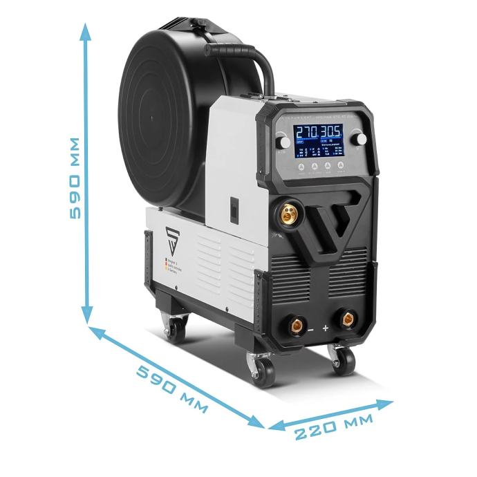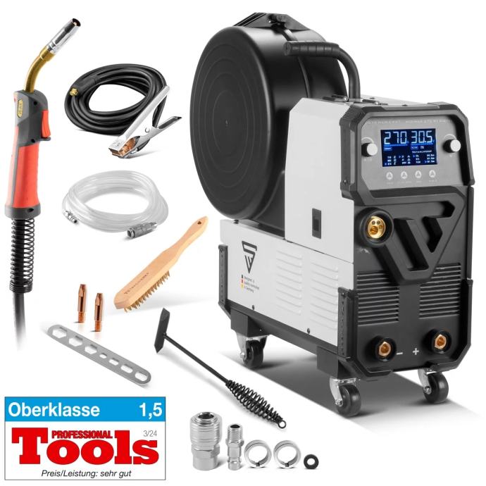 STAHLWERK MIG MAG 270 ST Digitalni aparat za zavarivanje ima sinergijsko dodavanje žice, radi do 270 A i prikladan je za MIG MAG zavarivanje, kao i za FLUX, Lift TIG i MMA/ARC primjene – tako da je moguće i zavarivanje bez zaštitnog plina. Uređaj ima brojne parametre zavarivanja i omogućuje precizno zavarivanje tankih limova, metalnih ploča i nehrđajućeg čelika. Snažan pogon s 4 valjka osigurava pouzdano dovod žice, koji kontinuirano i sigurno prenosi čak i deblje žice za zavarivanje tijekom MIG MAG zavarivanja. Parametri zavarivanja mogu se lako očitati na jasnom digitalnom zaslonu. Različiti načini rada mogu se brzo postaviti pomoću intuitivnog izbornika. Opremljen najnovijom generacijom IGBT tehnologije, inverter nudi izvrsna svojstva zavarivanja zahvaljujući većoj učinkovitosti i smanjenoj potrošnji energije. Zahvaljujući optimalnim parametrima performansi, svestrani kombinirani aparat za zavarivanje može se koristiti za gotovo sve zahtjeve i uvijek osigurava savršen rezultat rada. Osim pametnog hlađenja s integriranom zaštitom od pregrijavanja, aparat za zavarivanje u zaštiti plina ima sinergijsko dodavanje žice. Brzina dodavanja žice automatski se regulira postavljenom strujom zavarivanja. Kompaktni dizajn i mala težina osiguravaju jednostavan transport i udoban rad. Funkcija točkastog zavarivanja posebno je prikladna za tanke dijelove karoserije u automobilskom sektoru. To osigurava da su točke šivanja precizno ponovljive i ravnomjerne. Funkcija spot osigurava da samo mala količina topline dopire do obratka, što dovodi do manjeg izobličenja. Način rada 2T/4T nudi naprednu kontrolu nad protokom struje.