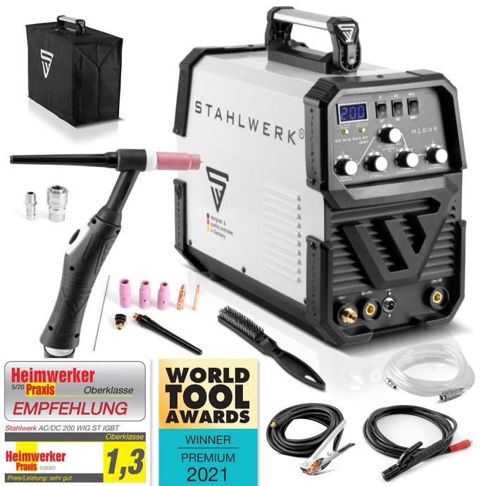 STAHLWERK AC/DC TIG 200 ST snažan je aparat za TIG zavarivanje s funkcijom MMA/MMA zavarivanja. Jedna od prednosti ovog 2-u-1 kombiniranog aparata za zavarivanje na izmjeničnu struju je njegov kompaktan dizajn i mala težina od samo 11,5 kg. AC/DC TIG 200 ST ima praktične funkcije kao što su pametno hlađenje i integrirana zaštita od pregrijavanja. Kod TIG zavarivanja beskontaktno HF paljenje omogućuje ugodan rad i bolje rezultate zavarivanja. Unaprijed i nastavak plina za zavarivanje može se individualno prilagoditi kako bi se volframova elektroda zaštitila od trošenja i spriječila oksidacija zavarenog šava. Najsuvremenija IGBT tehnologija omogućuje maksimalne performanse kod TIG i MMA zavarivanja. Aparat za zavarivanje AC/DC TIG 200 ST IGBT isporučuje se s opsežnim paketom pribora.