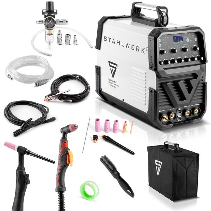STAHLWERK AC/DC TIG 200 Puls CUT ST višenamjenski je aparat za TIG zavarivanje s funkcijom plazma rezanja i MMA ili funkcijom zavarivanja elektrodom. Jedna od mnogih prednosti ovog kombiniranog aparata za zavarivanje 3-u-1 je njegov kompaktni dizajn i mala težina od samo 13 kg, s funkcijom rezanja plazmom, materijal debljine do 12 mm može se rezati pri 50 ampera. AC/DC TIG 200 Puls CUT ST ima opsežnu pulsnu funkciju, koja između ostalog olakšava zavarivanje tankih limova. Parametri kao što su pulsna struja, pulsna frekvencija, dugi i kratki puls mogu se lako podesiti. Daljinski upravljiva kontrola struje na plameniku za zavarivanje ili nožnoj papučici (dostupna kao opcija) nudi vam prednost da možete regulirati struju i tijekom procesa zavarivanja. Najsuvremenija IGBT tehnologija omogućuje maksimalne performanse kod TIG i MMA zavarivanja, kao i rezanja plazmom.