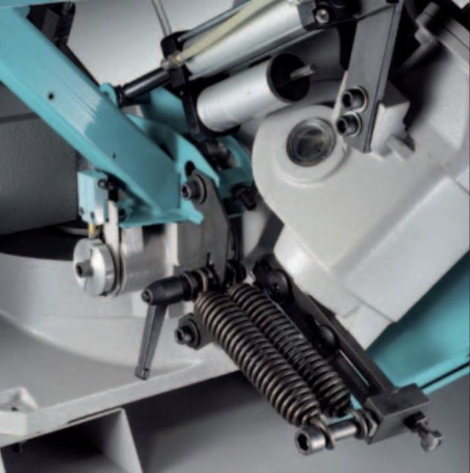 Snažan čelični okvir, 320 mm promjer pilenica, visoka napetost alata od 1700 kg/cm2, izmjenjivi karbidni umetci vodilica alata, klizno podesiva prednja vodilica, manualni škrip sa funkcijom brzog stezanja i otpuštanja, štitnik okvira na šarkama za brzu i jednostavnu izmjenu alata, elektronski nadzor napetosti alata, analogni prikaz opterećenja motora, samodijagnostika, potopni sustav hlađenja u dvije točke, automatski hidraulički posmak sa preciznom regulacijom, dvije rezne brzine.