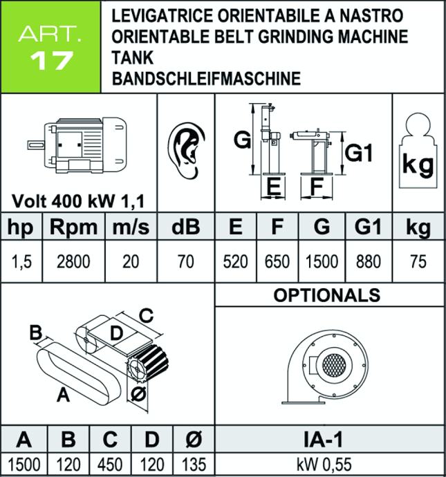 Snaga motora 1,1 kW, dimenzija brusne trake 1500x120 mm.