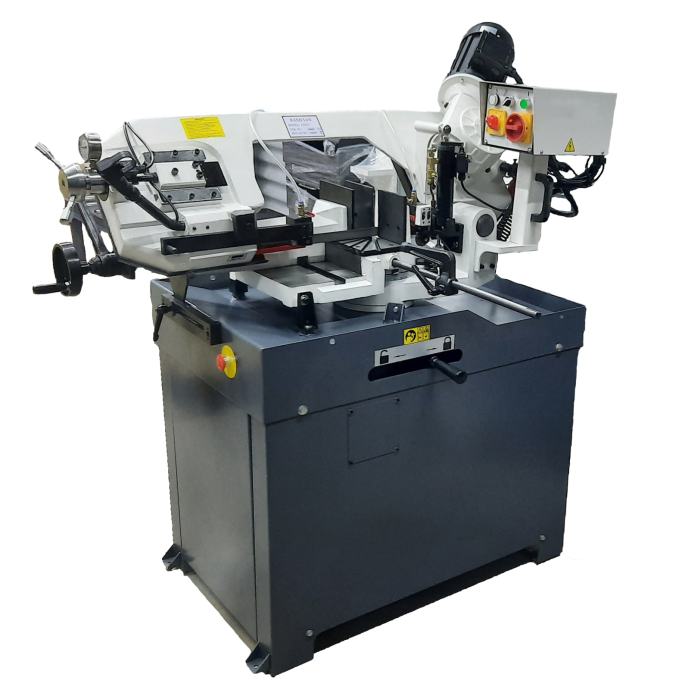 Profesionalna tračna pila za metal 5025 omogućuje rezanje pod kutom u oba smjera, što je čini iznimno fleksibilnom i praktičnom za radionice i industrijsku upotrebu. Opremljena je emulzijskim sustavom hlađenja, hidrauličnim cilindrom za podešavanje hoda i manometrom za prikaz napetosti lista pile.
