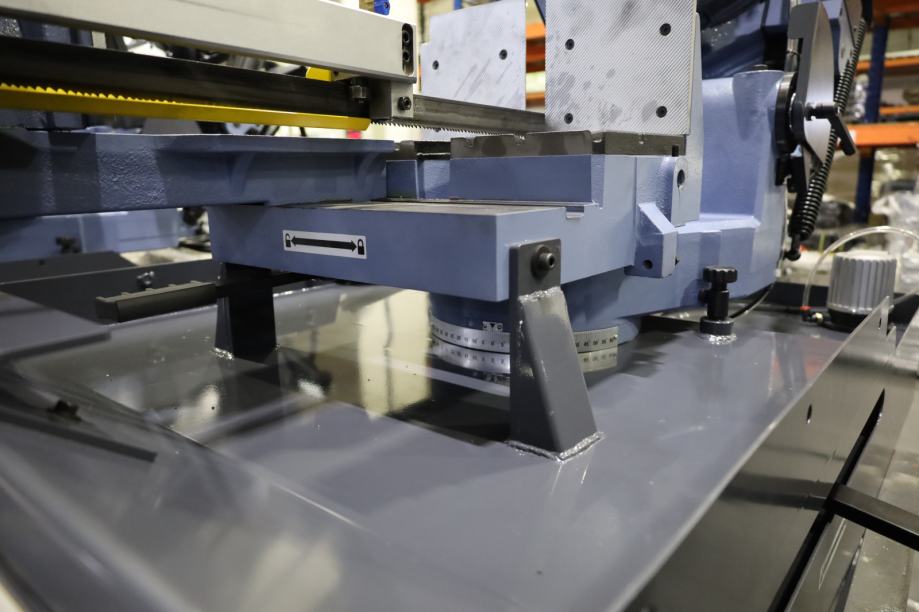 Snažna tračna pila za metal s inverterom, hidrauličnim stegom i automatskim pomakom. Vodilice lista izrađene su od tvrdog metala, što osigurava precizno rezanje i dug vijek trajanja. Pila je trofazna, s ugrađenim sustavom podmazivanja, indikatorom napetosti lista i reduktorom.