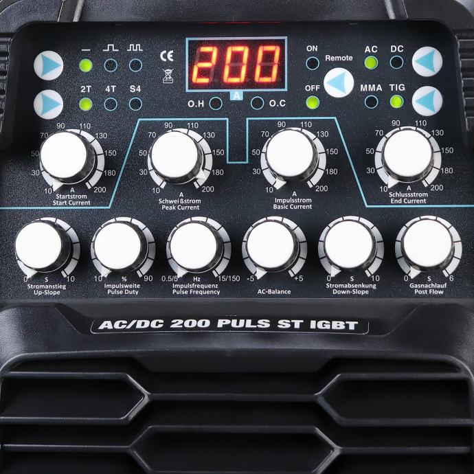 Opsežna pulsna funkcija - TIG PULS - Sprječava izgaranje materijala i smanjuje deformacije zbog topline, posebno prikladno za zavarivanje tankih ploča, čiji se materijal može samo malo zagrijati. Podesivi parametri su: osnovna struja, rad pulsa, frekvencija impulsa, dugi i kratki impuls.