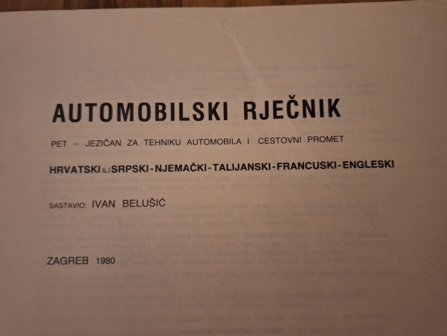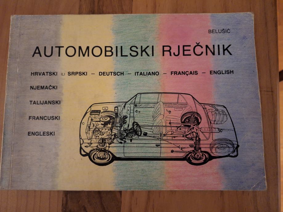 Automobilski rječnik na hrvatskom, njemačkom, talijanskom, francuskom i engleskom jeziku, autora Ivana Belušića iz 1980. godine. Sadrži 2100 naziva-izraza-pojmova u području tehnologije motornih vozila i cestovnog prometa. Sadrži crteže-skice označeni brojevima prema osnovnom dijelu rječnika.