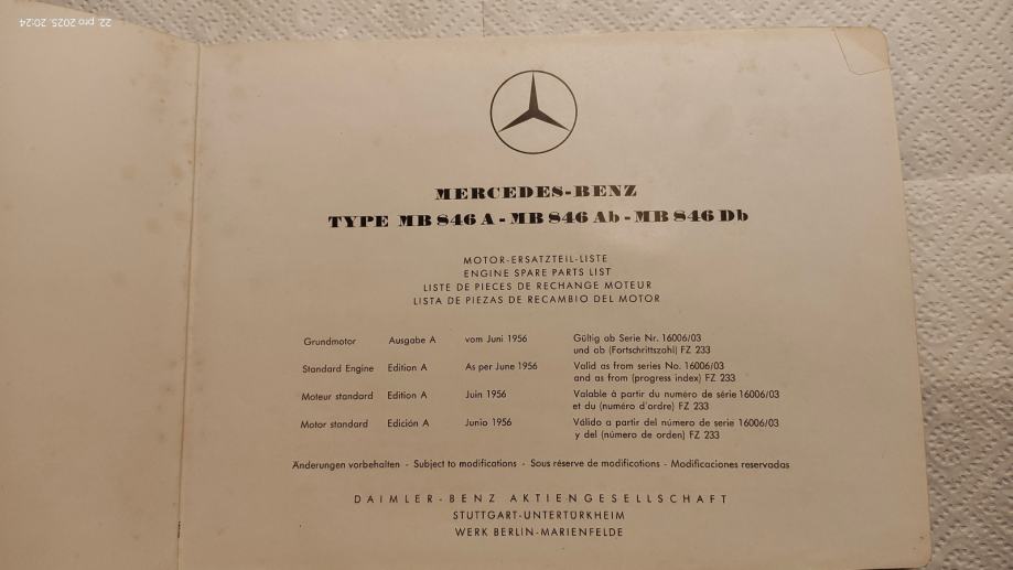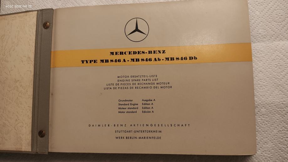 Prodajem odlično sačuvanu knjigu-katalog sa kompletnim popisom i slikama za Mercedes motor MB 846 iz 1956 god. pisana objašnjenja na četri jezika i preko sto stranica, Njemački,Engleski,Španjolski i Francuski.Raritet!! Samo osobno preuzimanje.Sve info na 095/8722-722