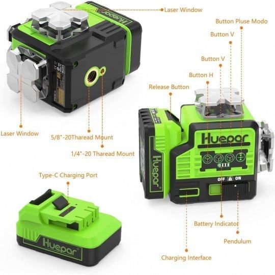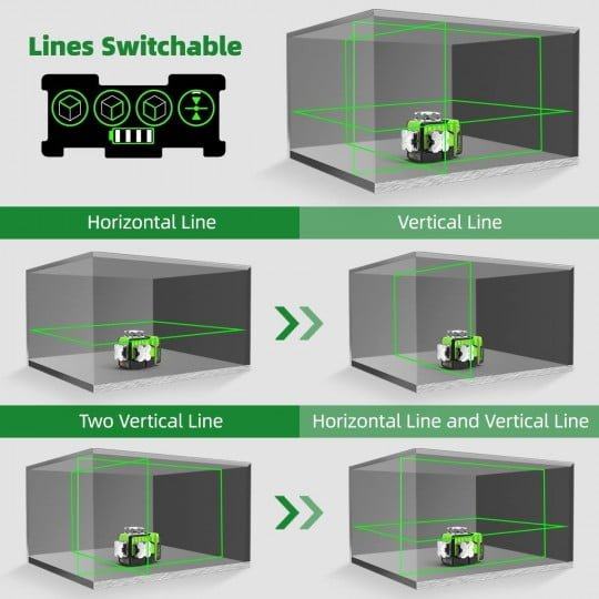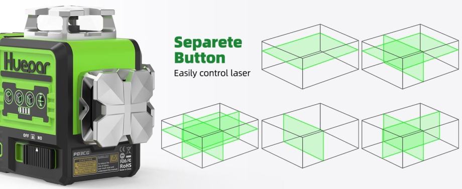 Huepar laserska razina ima jednu vodoravnu ravninu od 360 °, dvije vertikalne ravnine od 360 °, 12 laserskih linija koje mogu pokriti pod, zidove i strop u cijeloj sobi. Horizontalne i okomite linije koje prelaze pod kutom od 90 ° pomažu vam da brzo vizualizirate i dovršite kvadratni izgled. Svaki gumb na ovoj razini lasera odgovara jednoj laserskoj liniji, jednostavno možete odabrati uključivanje/isključivanje bilo koje laserske linije.