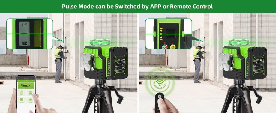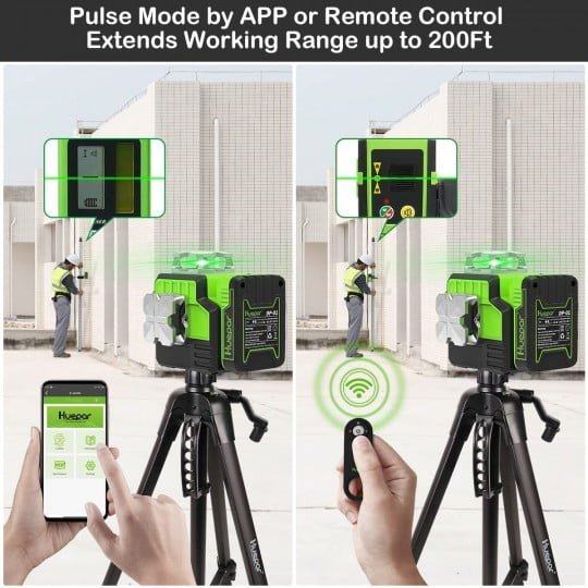 Bluetooth povezivanje omogućuje vam kontrolu laserskog postavljanja iz cijele sobe pomoću aplikacije Huepar na pametnom telefonu ili daljinskom upravljaču. Aplikacija i daljinski upravljač mogu uključiti/isključiti laserske linije i impulsni način i odabrati laserske ravnice. Aplikacija Huepar također nudi alarm vanjske razine. Laserski alati mogu istovremeno povezati dva Bluetooth uređaja. S daljinskim upravljačem poravnanje postaje jednostavno i brzo.