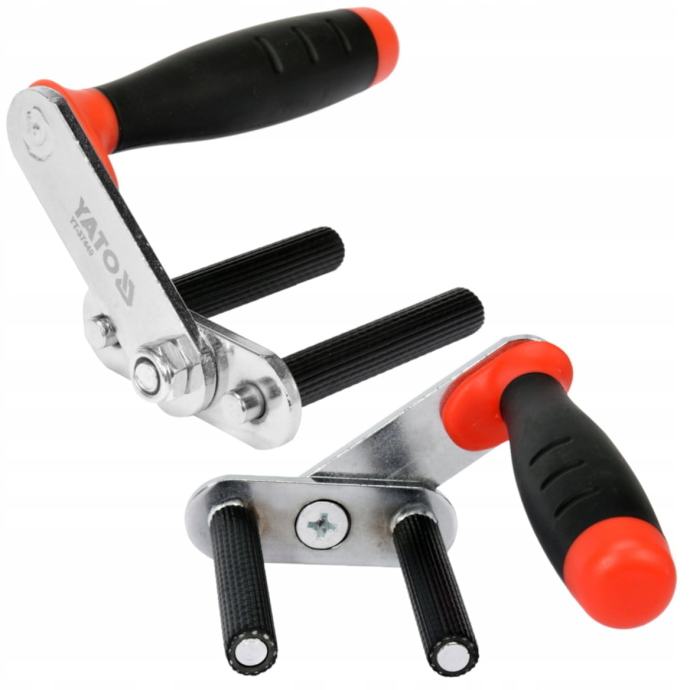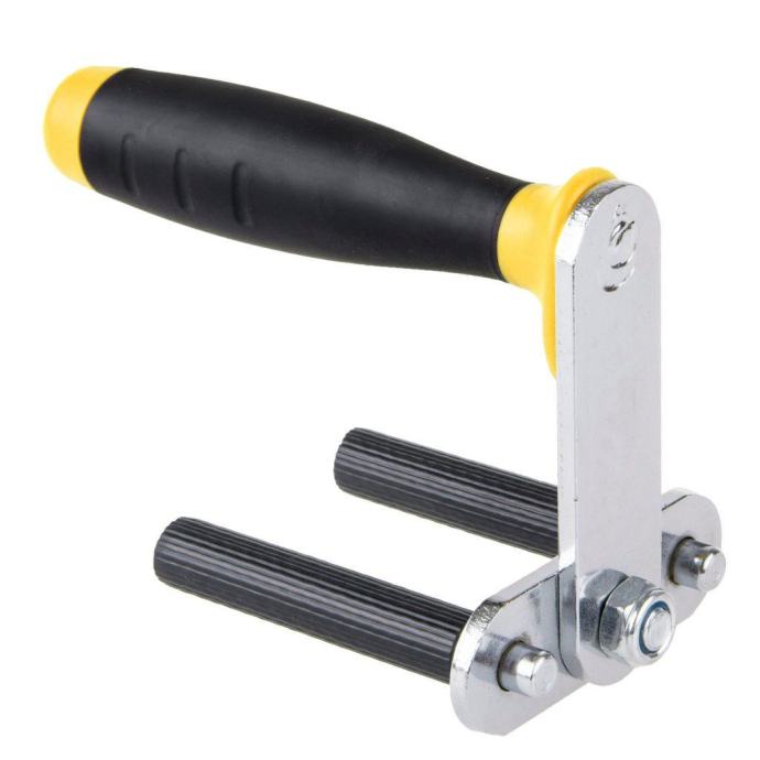 Profesionalna ručka za nošenje žbuke od čelika, obložena plastikom. Dobro osmišljen i isprobani dizajn uzrokuje automatsko, snažno stezanje ručke na ploču koju nosite. Držači stezanja dizajnirani su za nošenje ploča od strane dvije osobe. U kompletu postoje dvije ručke. Pored gipsum ploča, možete sigurno preuzeti sve drvene ploče ili vrata s ručkama.