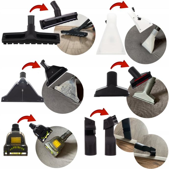 Kako funkcionira usisavač? - Ima sustav od dva tenka. Ulijte vodu i sredstvo za čišćenje u jedno, dok se drugi automatski napuni rabljenom i prljavom vodom. Spremnik deterdženta ima kapacitet od 3,5 litara, a spremnik prljave vode nakon pranja 20 litara. U kompletu je 6 savjeta! Vrh čišćenja turbo podni dio dizajniran je za čišćenje glatkih površina i tepiha, uklanja tvrdoglavu prljavštinu, poput životinjske kose, zahvaljujući rotirajućem valjku sa sintetičkim elementima kolekcije. Na primjer, uska mlaznica s pomičnim vrhom savršena je za čišćenje kutova setova za sjedenje, letvica, stropova i drugih uglova. Mali vrh u obliku T savršen za sisanje tepiha, tepiha i presvlake. Mlaznica za čišćenje vodom sprejom, vrhom prskanja i podnom četkom.