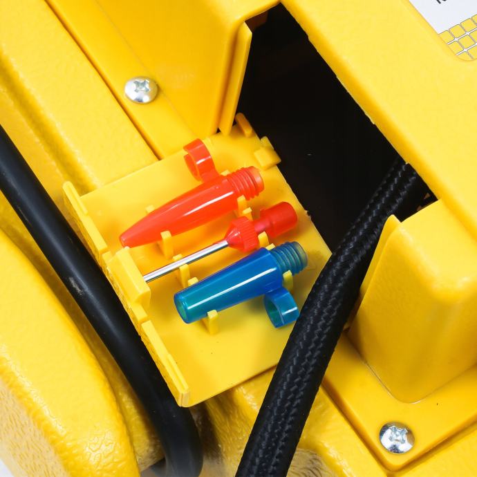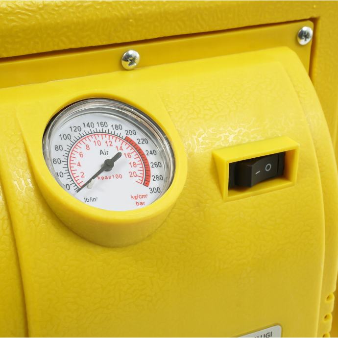 Kompresor - Alat ima ugrađeni kompresor zraka s mjeračem tlaka. Ima crijevo s ventilom za automobile i 3 savjeta za pumpanje raznih dodataka kao što su kuglice, madraci itd. Tlak kompresora je 20 bara / 300 pasa.