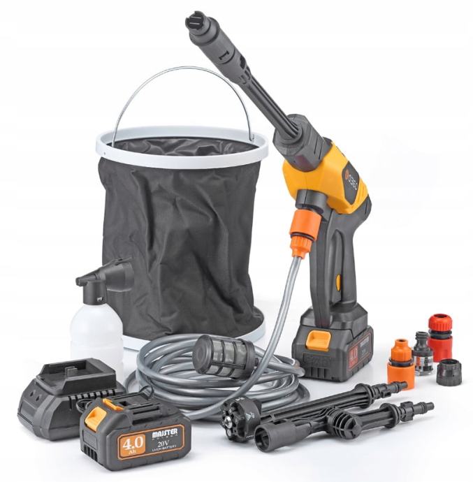 Perilica je opremljena dugom cijevi i setom potrebnih mlaznica. Zahvaljujući napajanju baterije, uređaj možemo povesti sa sobom gdje god nam treba. Komplet je preklopna kanta koja omogućuje upotrebu perilice rublja bez povezivanja s tekućom vodom.