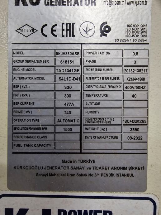 prodajem agregat( generator) Volvo KJV 330 ASB 330 (kva) godište 9/2022 ...2000 radnih sati..stanje skoro nov