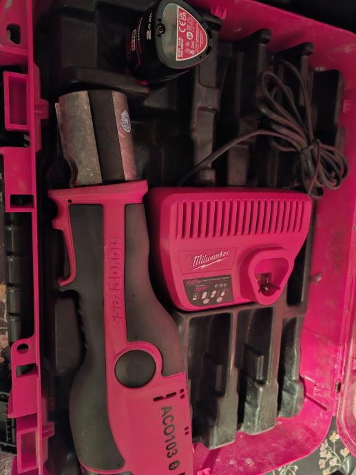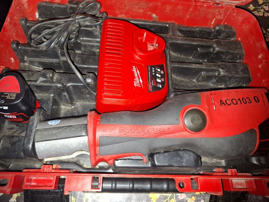Milwaukee Novopress akumulatorska presa (model ACO103) s Milwaukee punjačem i baterijom, pohranjena u originalnom crvenom kovčegu.