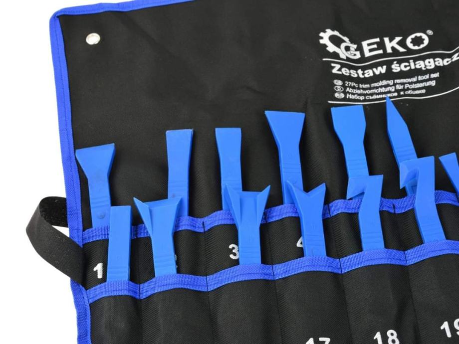 Profesionalni set alata za skidanje tapeciranog namještaja tvrtke GEKO. Izrađen od kaljenog najlona, set ima profile koji omogućuju korištenje poluge prilikom skidanja kopči za tapecirani namještaj.