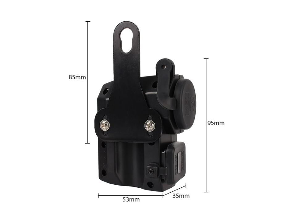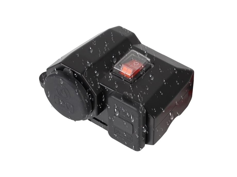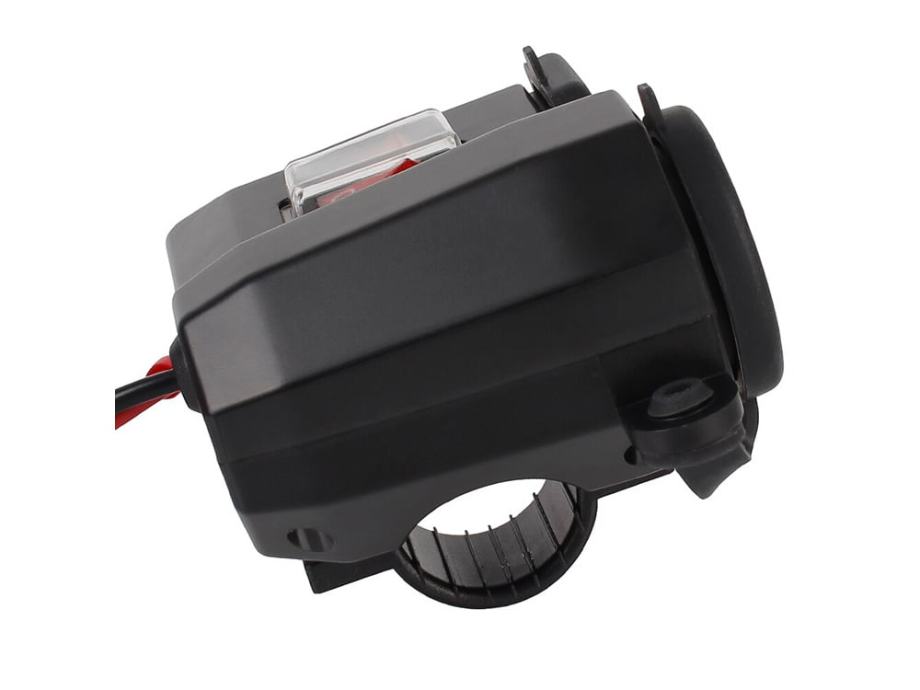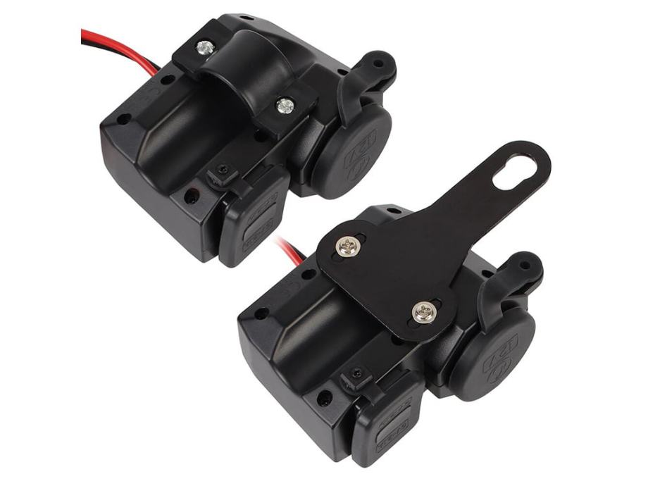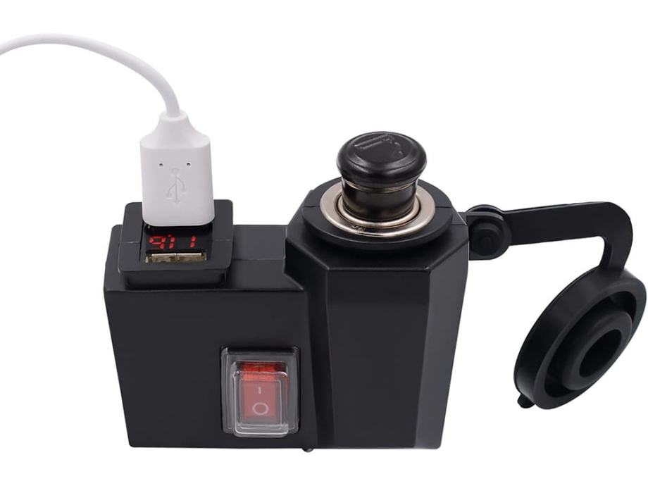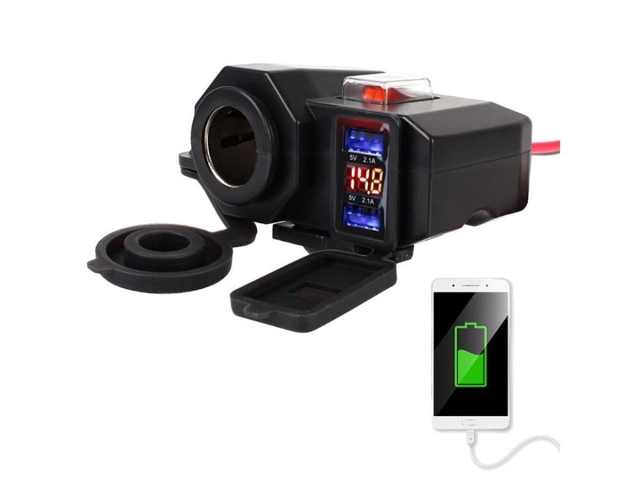 Vodootporna utičnica za upaljač za cigarete za motocikl, skuter, četiri -wheeler. Opremljen je voltmetrom koji pokazuje napon za punjivanje baterije. Pored toga, ima dvije USB 2.1A veze. U utičnicu ima dva gumena čepa koja ga štite od vremena.