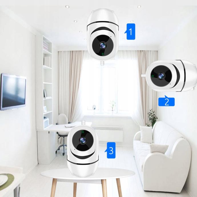 Zahvaljujući jedinstvenom dizajnu i rotirajućoj glavi, kameru možete instalirati bilo gdje. Objesite kameru visoko, na nepristupačno mjesto (1) da pokrijete sav prostor kontrolira, objesite je na zid (2) tako da ne ometa dom ili je stavite na tablicu (3). Spojite ga na USB priključak s kabelom koji je uključen u komplet - kada je spojen izravno na napajanje, kamera može neprekidno raditi 24 sata dnevno dok ne zatrebate.