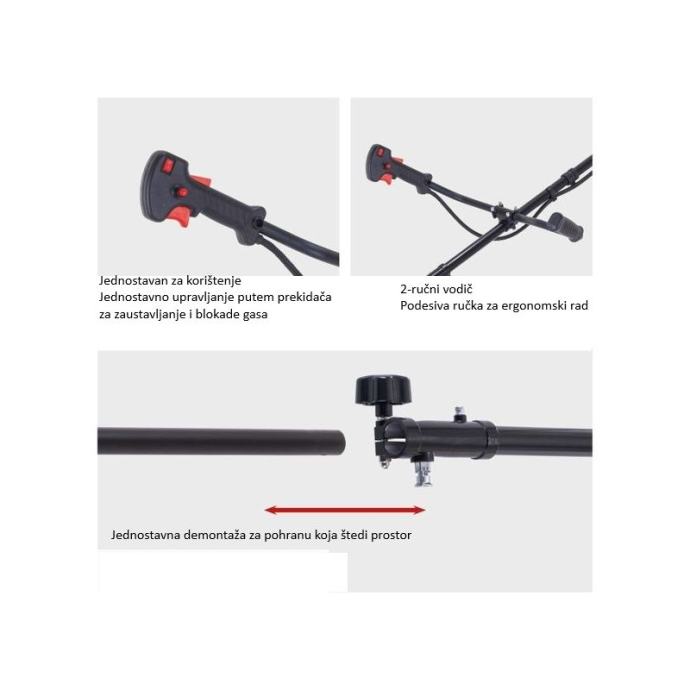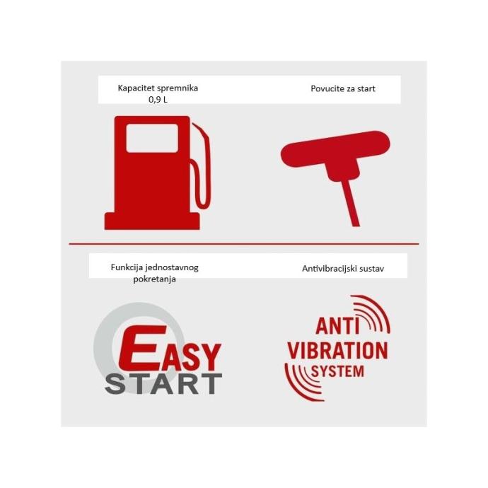 Benzinski trimer PBC330 kombinira trimer sa strunom i kosu s nožem u jednom uređaju, što operativno pokriva i fini rubni rad i agresivniju košnju šikare. Dvotaktni benzinski motor snage 0,9 kW (1,21 KS) i obujma 32,5 cm³ daje stabilan moment za kontinuiran rad na zapuštenijim površinama, bez ovisnosti o napajanju.Upravljanje je postavljeno kroz podesivu ručku s dvoručnim hvatom, što poboljšava kontrolu smjera i rasterećuje zapešća kod duljih intervala rada. Remen za rame preuzima dio mase uređaja i smanjuje zamor leđa, posebno kod košnje većih površina. Sigurnosno-operativno, stop prekidač i blokada gasa omogućuju brzo zaustavljanje i kontrolu gasa u radu.Za trimer način rada koristi se dvostruki kalem s brzim uvlačenjem niti, a za gušću vegetaciju koristi se nož (kosa) s manjom širinom zahvata radi kontrole i opterećenja motora. Anti vibracijska tehnologija smanjuje prijenos vibracija na ruke i olakšava duži rad. Konstrukcija je predviđena i za praktično skladištenje kroz jednostavno sastavljanje/rastavljanje.Tehnički podaci NazivBenzinski trimer PBC330, 0,9 kW, 1,21 KS ModelPBC330 Snaga0,9 kW (1,21 KS) Obujam motora32,5 cm³ Vrsta pogonamotor s unutarnjim izgaranjem (dvotaktni) Širina košnje (trimer sa strunom)420 mm Širina košnje (kosa/nož)255 mm Emisijski standardEuro V Emisija CO²992,04 g/kWh Neto težina7,67 kg Bruto težina9,35 kg Dimenzije (D × Š × V)1820 × 610 × 410 mm Najčešća pitanja (Q&A) Za što je namijenjena Benzinski trimer PBC330 (0,9 kW / 1,21 KS) i gdje ima najviše smisla? Namijenjena je za košnju visoke trave i gušćeg raslinja na okućnicama i terenima gdje klasični trimer zapinje ili ne može prići. Prednost je što je to “2 u 1” rješenje: trimer za travu za rubove i nepristupačne zone + kosa/nož za jače raslinje. Koja je širina košnje i kada koristiti nit, a kada nož? Širina košnje je 420 mm s trimer glavom (nit) i 255 mm s nožem (kosa). Nit koristite za travu, rubove uz ogradu i oko prepreka; nož koristite za gušće raslinje i tvrđu travu gdje je potreban agresivniji rez. Koje su ključne specifikacije motora i što to znači u praksi? Motor je dvotaktni, snage 0,9 kW / 1,21 KS i obujma 32,5 cm³. U praksi: dobar omjer snage i mase za “DIY + zahtjevnije” košnje, uz tipičnu dvotaktnu logiku rada (viši okretaji i brza reakcija na gas). Kakvo je upravljanje i ergonomija (ručka, remen) za dulji rad? PBC330 ima podesivu bicikl ručku (dvoručno upravljanje) i remen za rame, što daje bolju kontrolu i rasterećuje ruke/leđa kod duljeg košenja. Antivibracijska tehnologija dodatno smanjuje zamor pri serijskom radu. Kako se pokreće i koje sigurnosne funkcije ima? Pokretanje je preko Easy Start sustava za lakše paljenje. Za sigurnost i kontrolu tu su prekidač za zaustavljanje i blokada gasa, što smanjuje rizik nenamjernog ubrzanja i olakšava gašenje u slučaju potrebe. Kolika je masa i dimenzije stroja (transport i skladištenje)? Neto težina je 7,67 kg, bruto 9,35 kg. Dimenzije stroja su cca 1820 × 610 × 410 mm. Konstrukcija je predviđena za jednostavno sastavljanje/rastavljanje, što olakšava skladištenje i prijevoz u ograničenom prostoru. Koje su ključne oznake za identifikaciju (EAN / šifra) i emisijski standard? Broj artikla: 5910714915 Oznaka modela: PBC330 EAN: 4046664228226 Emisijski standard: Euro V Emisije CO²: 992,04 g/kWh Što uzeti uz PBC330 (cross-sell) da košnja ide brže i bez prekida? Operativno najčešće ide zajedno: • Vrt i okućnica (potrošni materijal za košnju i održavanje)• Zaštitna oprema (naočale, rukavice, zaštita sluha – rad s trimerom)]]>