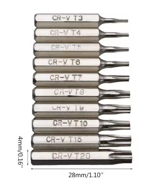 U pakiranju su: T3, T4, T5, T6, T7, T8, T9, T10, T15, T20 (vidi slike). Torks torx bit bitovi nastavak nastavci
