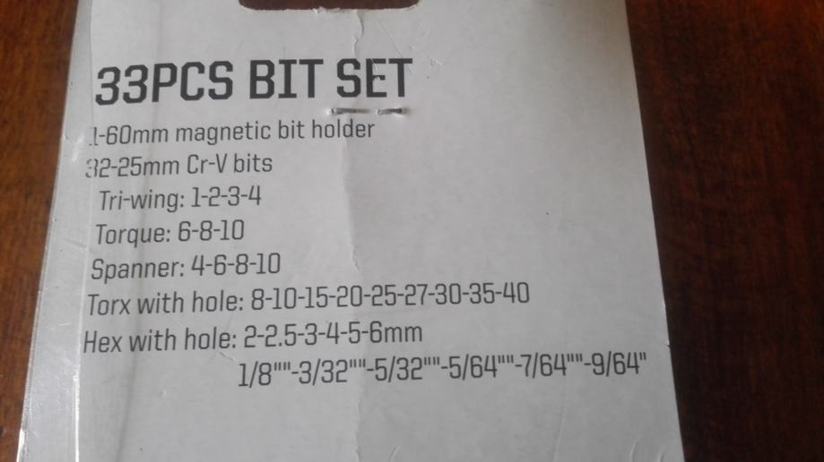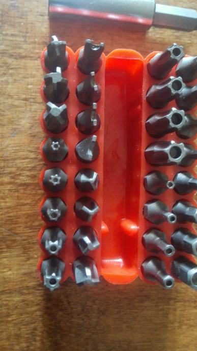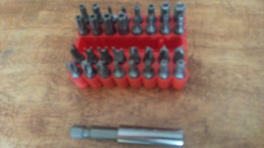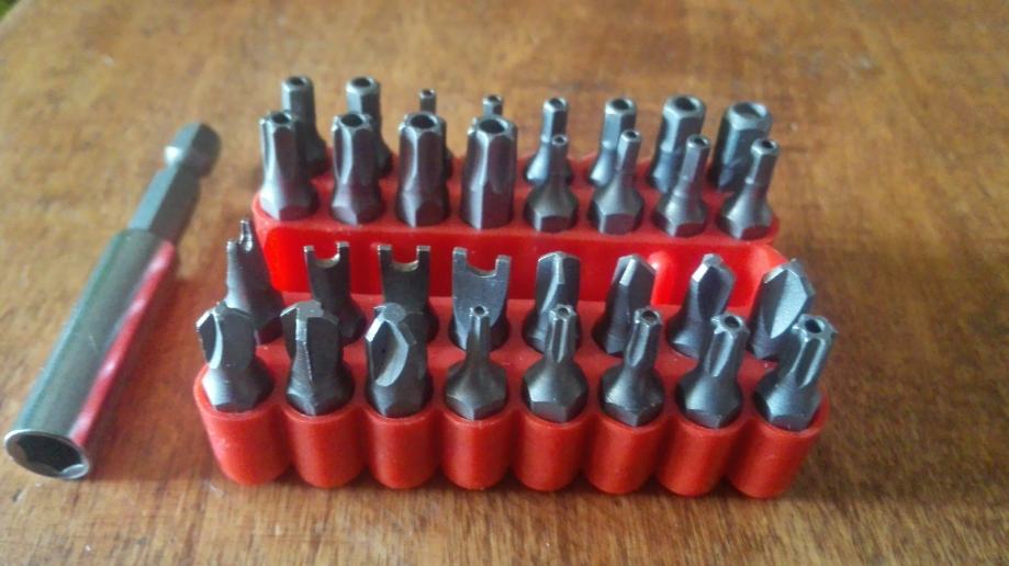 Set se sastoji od 32 nastavka za odvijanje,jednog produženog dijela u kojeg se stavlja bit za aku bušilicu i plastičnog držača po 32 bita.