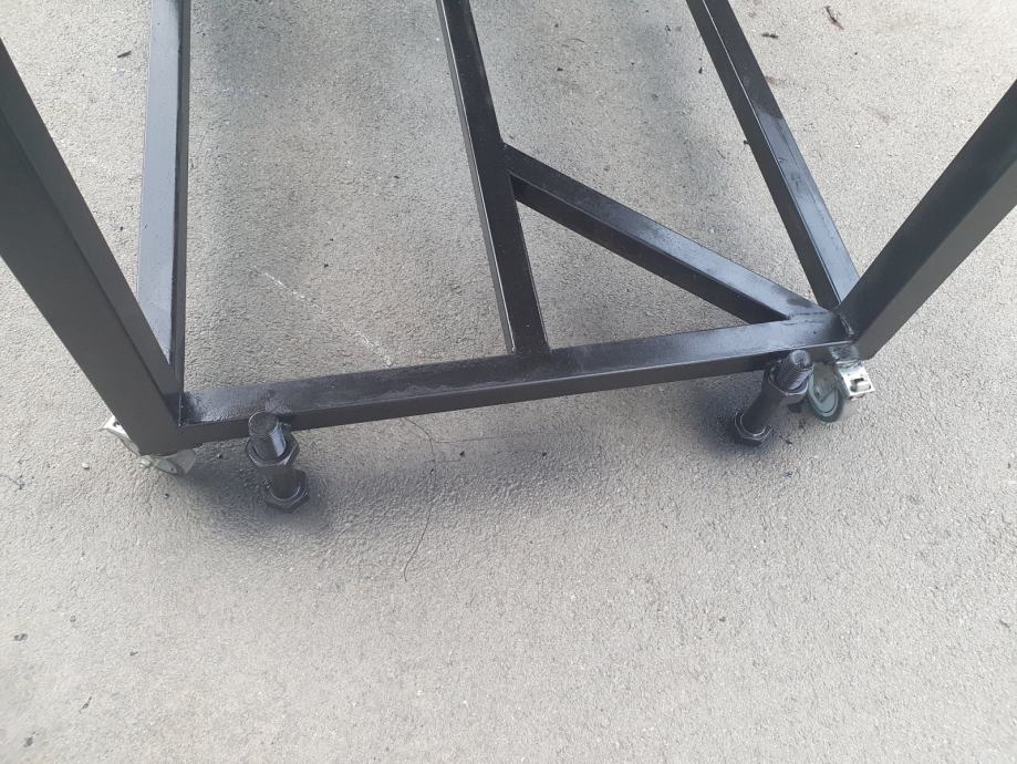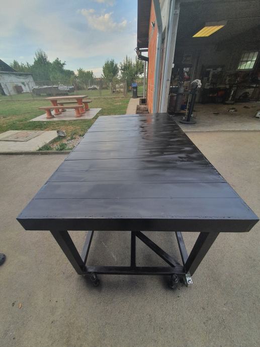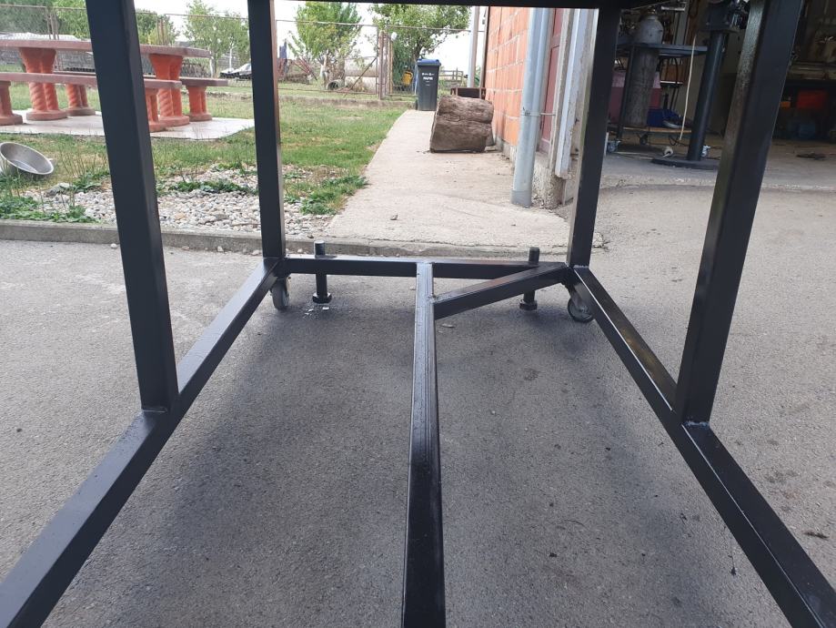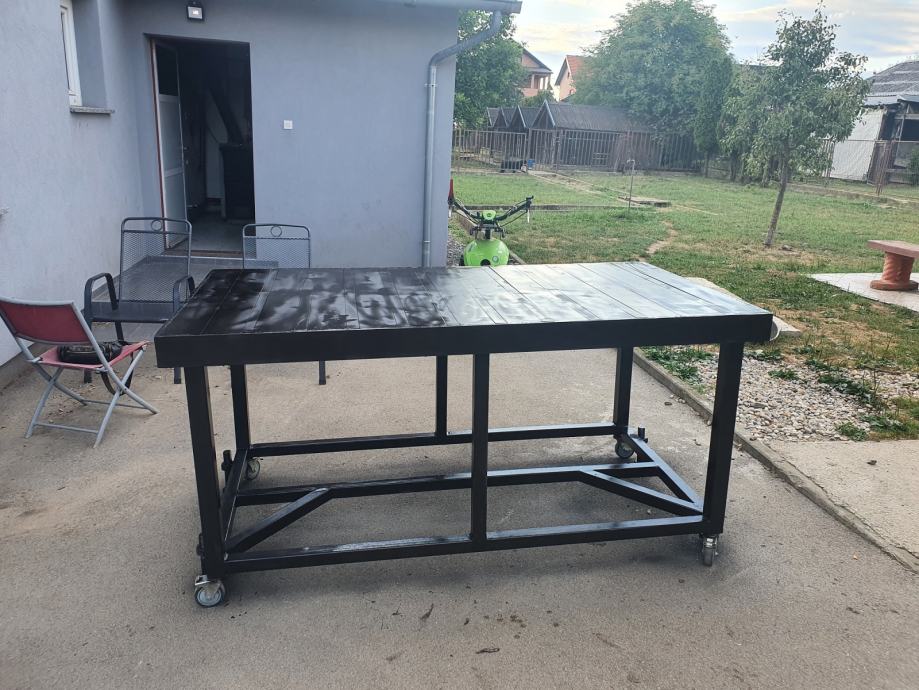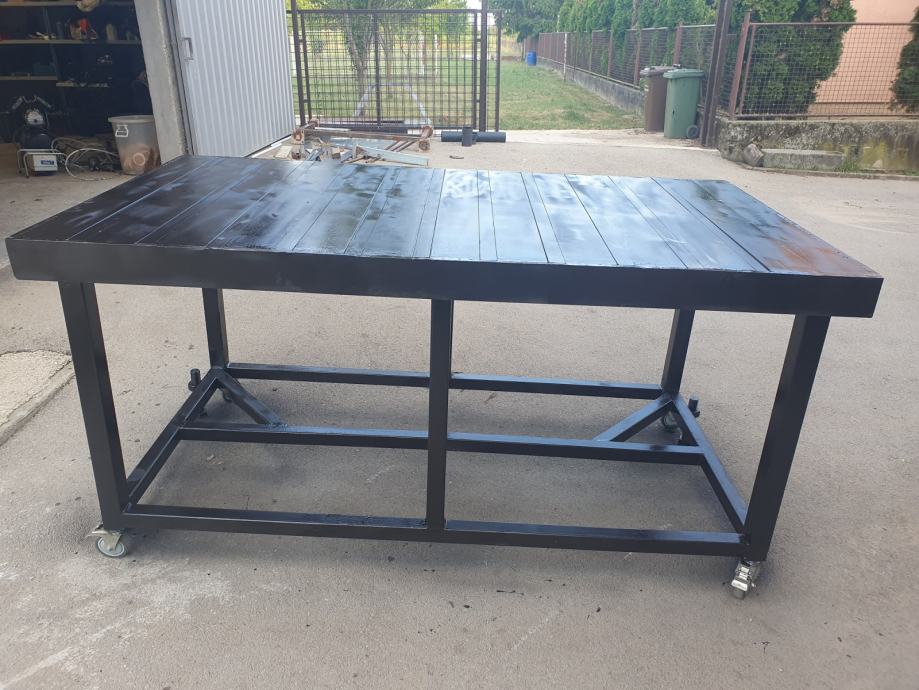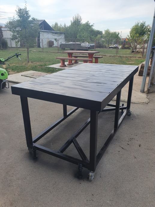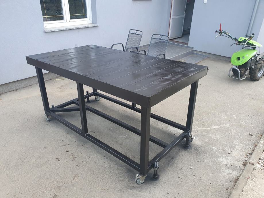 masivni bravarski stol težine cca 250 kg. D-2x Š-1,10 x V-1m. Debljina mesa profila 3mm. Cečične ploče debljine 8mm gore i 10mm strane stola. stol je na kotačima i ima fiksatore, namjena laka i srednja bravarija. Uži flahovi 4 cm širine se skidaju da se umetnu stege po potrebi i želji., kao I kod rezanja plazmom ili brusilicom.