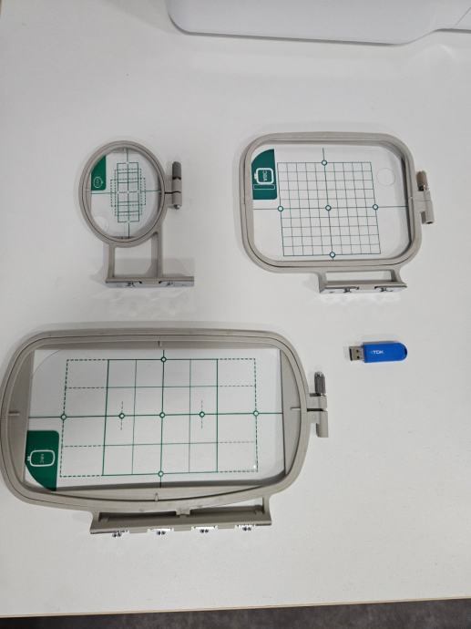Također dolazi sa setom zamjenskih igla, uljem za podmazivanje, koncima, bobbinima i USB stickom formatiranim za stroj.