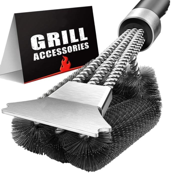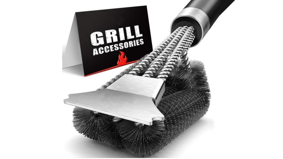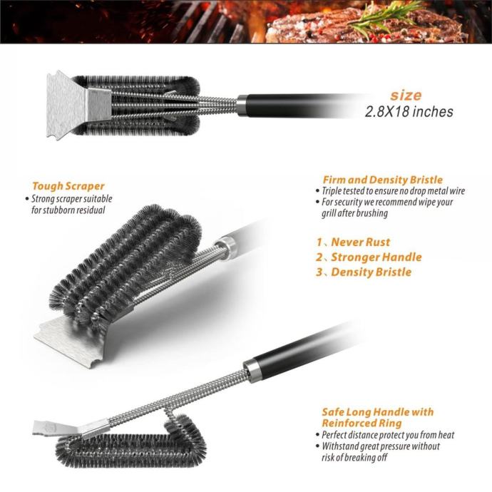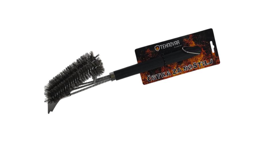 Četka za roštilj s troglavom glavom četke i kratkom drškom. S ovom četkom možete brzo i snažno očistiti rešetke roštilja.