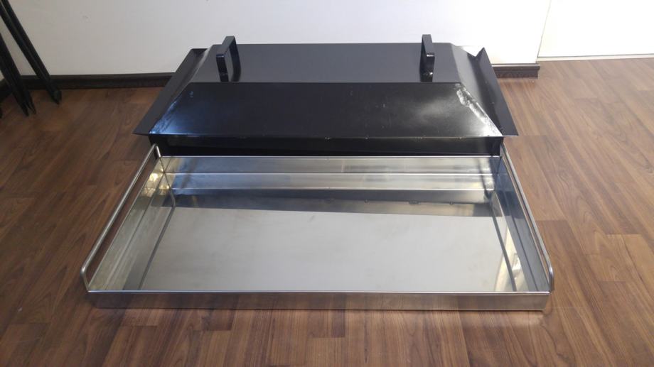Željezno zvono sa inox tacnom. Limeno zvono dimenzija 35x60 cm, sa zavarenom ručkom za dizanje i prstenom za žar sa odgovarajućom inox tacnom. Jednostavna uporaba, vrhunski okus pečenja. Zbog četvrtastog oblika, veća je iskoristivost prostora!