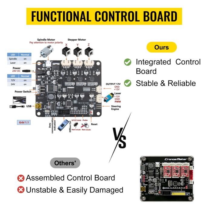 Možete uživati u užitku graviranja plastike, mekog aluminija, akrila, PVC-a, PCB-a i još mnogo toga. Graver podržava Windows 7, Windows 8, Windows 10, Linux, macOS sustav i drugi softver za izravan uvoz datoteka formata JPG, BMP, PNG, DXF za graviranje.Nadograđena upravljačka ploča: Integrirana GRBL kontrola ima punu funkcionalnost i stabilnost. A prednosti izvanmrežnog kontrolera leže u sljedećim: 1. Nema potrebe za povezivanjem s računalom; 2. Proizvoljan odabir izvanmrežnih datoteka za graviranje. 3. Ručno podesite položaj osi X, Y i Z kao početnu točku graviranja, ručno uključite ili isključite vreteno.4. Visoka preciznost: manje od 0,003 inča.