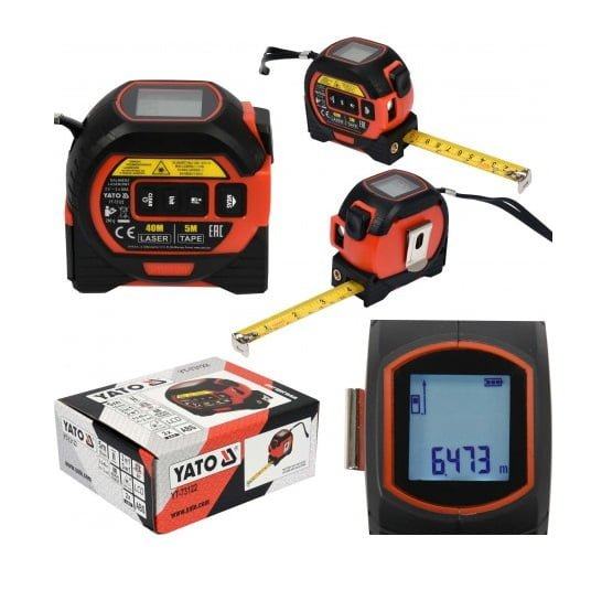 5m x 19 mm mjerač trake i laserski daljinski upravljač s mjernim rasponom od 0,2 do 40 m, također ima funkcionalni križni laser. Točnost prikaza +/- 2 mm. / 40 m odlikuje se jednostavnim intuitivnim kontrolom. Osnovne funkcije uključuju promjenu mjerenja jedinica /metra, inča, cipele /, mjerenje sa stražnjeg ili prednjeg zida kućišta, zbrajanje mjerenja, izračun površina, kubični volumen, trigonometrijska mjerenja, memorije 20 mjerenja, automatsko isključivanje.