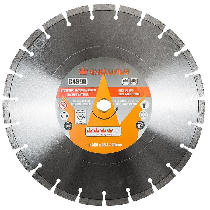 dijamantna ploča namijenjena za rezanje materijala kao što su beton, armirani betonza rezanje materijala pomoću električnih alata za rezanjepromjer diska je: 350 mm, debljina: 3,15 mm, rupa: 20/25,4 mm, dijamantna površina: 10 mmspecifičan profil dijamantnog ruba omogućuje rezanje najtvrđih materijala velikom brzinom bez ugrožavanja kvalitete završne obradeset uključuje smanjenje rupa sa 25,4 mm na 20 mmza suho i mokro rezanjelaserski lemljen segmentTehnički podaci: za upotrebu: suho/mokropromjer diska: 350 mmpromjer rupe: 25,4/20 mmdebljina diska: 3,15 mmpovršina dijamanta: 10 mmmaks. brzina vrtnje: 4300 o/minmaks. trenutna brzina na vanjskom rubu diska: 80 m/suključene stavke: 1 kom.težina: 1535 gtežina s pakiranjem: 1740 gdimenzije pakiranja (visina/širina): 355/355 mm]]>