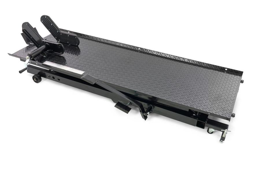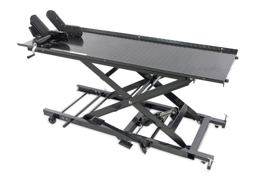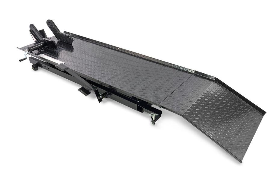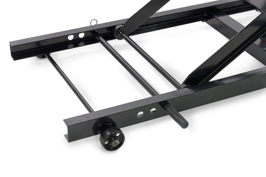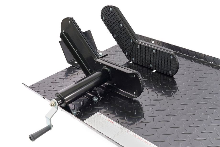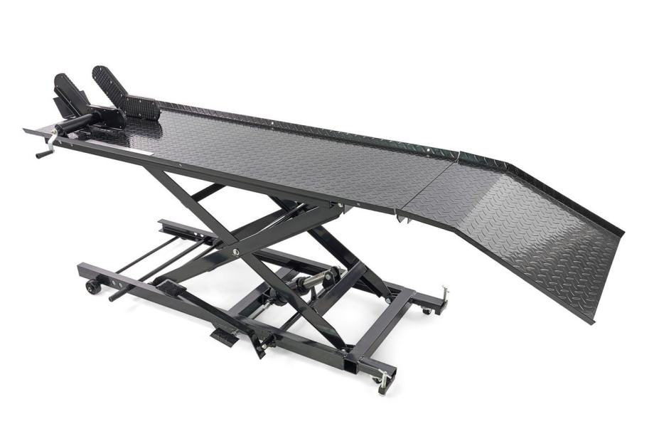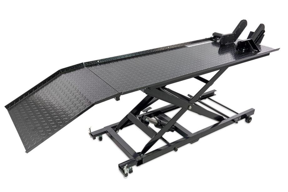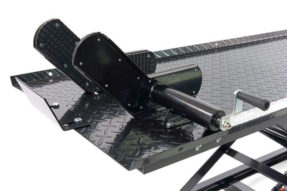 izuzetno pogodna dizalica za motocikle srednje veličine, skutere i mopedezaštitne oči s raznim rupama za pričvršćivanje za remenluksuzna stezaljka za prednje kotače sa zaštitom obručaprolazno stajališteizmjenjiva rampapodesive noge za niveliranjezaštita od pada