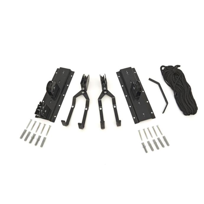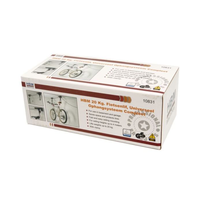 Dizalo za bicikl je vrlo praktičan sustav ovjesa za svaki bicikl, koji se može koristiti u tri svrhe:Spremanje bicikla bez zauzimanja prostoraVješanje bicikla kako bi se na ergonomski način obavili popravci na biciklu.Vješanje bicikla za zaštitu guma kada se bicikl ne koristi dulje vrijeme.Ovim liftom za bicikle možete podići bilo koji bicikl* sa stropa svoje garaže, šupe ili spremišta za bicikle. Sila koja vam je potrebna za to je ista kao i za podizanje ¼ težine bicikla, jer se u ovoj dizalici za bicikl koriste dvije koloture.Isporučeno najlonsko uže glatko prolazi kroz koloture, ali ako popustite napetost užeta, uže se automatski blokira, držeći bicikl da sigurno visi. Malim povlačenjem užeta, blokada se uklanja i možete polako spustiti bicikl natrag.Uz priloženi držač za kabel, najlonski kabel se pričvršćuje na zid, tako da je kabel uredno smotan, ali i tako da bicikl još uvijek visi u slučaju da blokada ne radi (dodatna sigurnost).Dvostruke kuke za podizanje s koloturom su podesive, tako da se uvijek može postići fleksibilno pristajanje uz upravljač, sjedalo ili nosač prtljage.*Podizač za bicikle dostupan je u dvije verzije:10831 za bicikle do težine od 20 kg10828 za bicikle do težine od 57 kgTehnički opis: Max dopuštena težina 57 kgDužina kabla 16 metaraNeto težina 2,9 Kg]]>