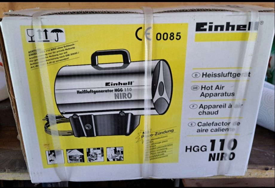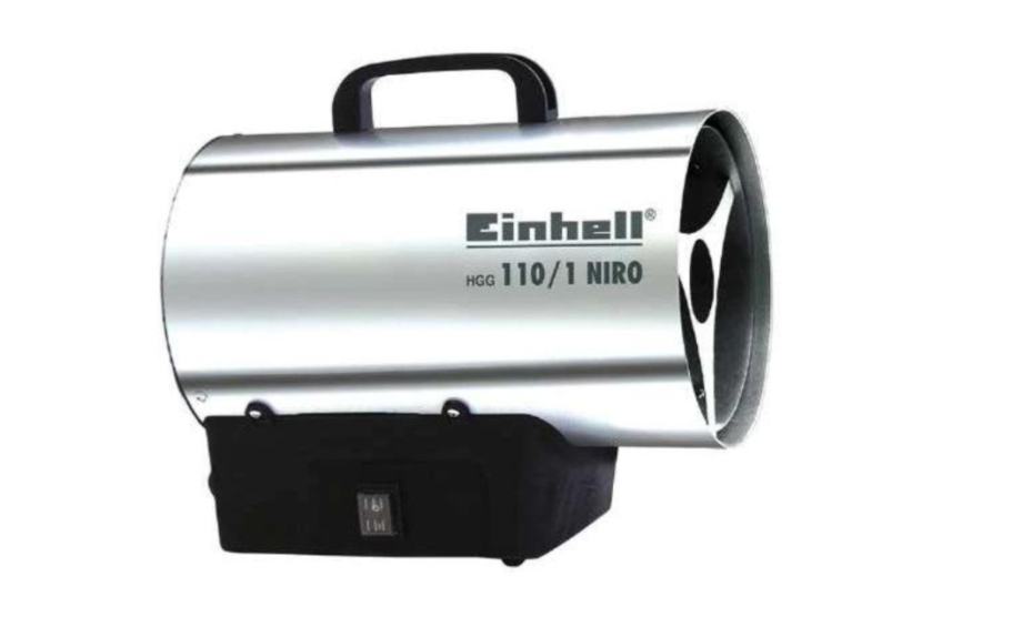 Einhellov plinski grijač HGG 110/1 Niro ima kućište od nehrđajućeg čelika, udobnu ručku, izmjenjivač topline izrađen od pocinčanog čeličnog lima, prekidač za uključivanje ili isključivanje, „piezo“ paljenje, protupožarna zaštita, plinska cijev, regulator tlaka, piezoelektrični odvodnik, plin i solenoidni ventil.