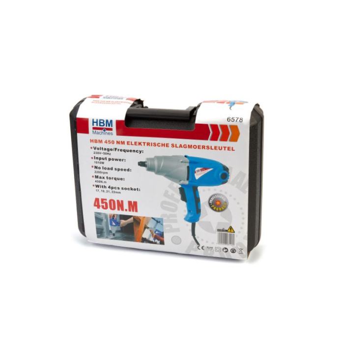 električni udarni pištolj 450 Nm je profesionalni ključ s velikim okretnim momentomovaj je alat stoga idealan za otpuštanje ili zatezanje teških vijaka i maticačetverokutni prihvat od 1/2" čini ovaj električni udarni ključ kompatibilnim sa srednjim do velikim utičnicamaset dolazi s četiri utičnice u različitim veličinama i električnim udarnim ključemsvi dijelovi savršeno pristaju u čvrstu plastičnu kutiju s umetcimadrška ima mekani premaz koji smanjuje vibracije tijekom rada s udarnim ključemudarni ključ opremljen je prekidačem koji vam omogućuje određivanje smjera vrtnjeovaj udarni ključ prikladan je za otpuštanje vijaka i zatezanje s visokim vrijednostima momentaTehnički opis: prihvat 1/2snaga 1010W / 230Vbroj okretaja 2200 RPMmaksimalni okretni moment 450 Nm.nasadni ključevi veličine 1/2 17, 19, 21 i 22 mm]]>