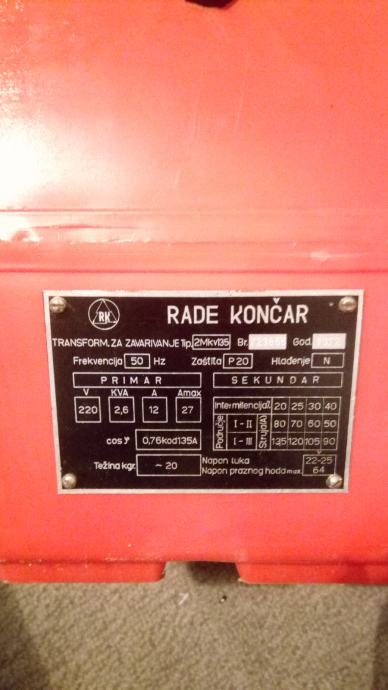 Elektro aparat za varenje KONČAR 2MKV135, monofazni , potpuno novi nikada korišten, ali nema kablove i kliješta za elektrodu.Napajanje 220 V, 12 -27 A, struja sekundara 50 do 135 A.