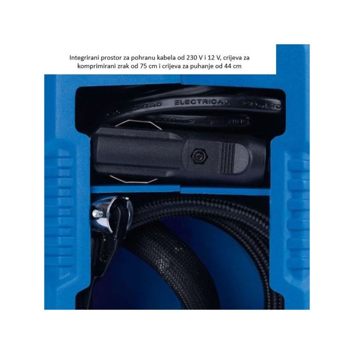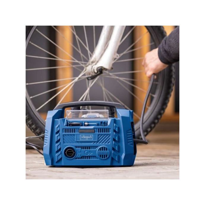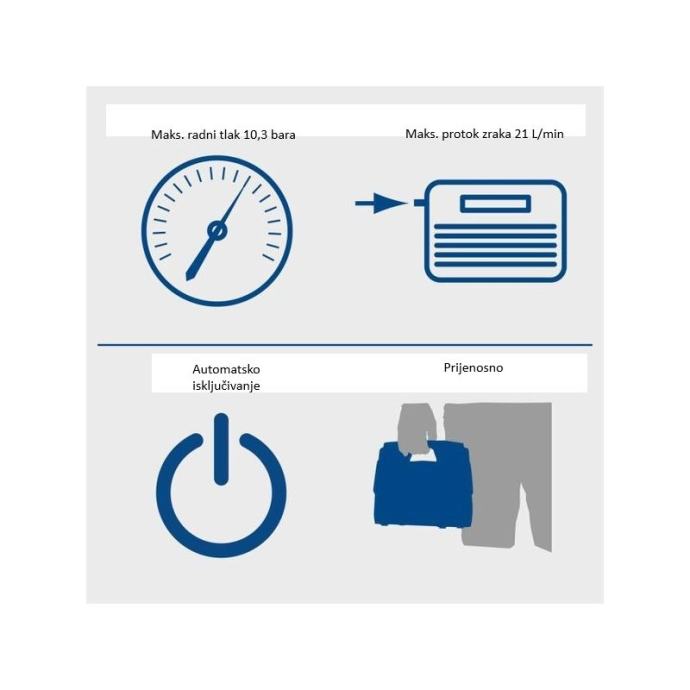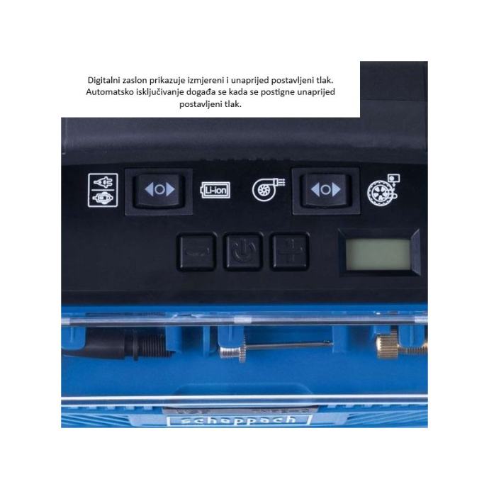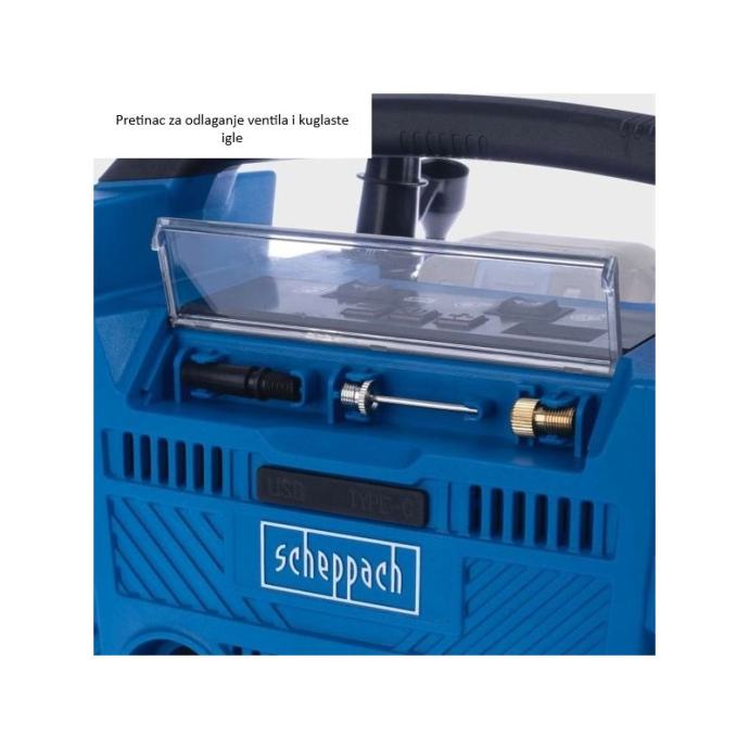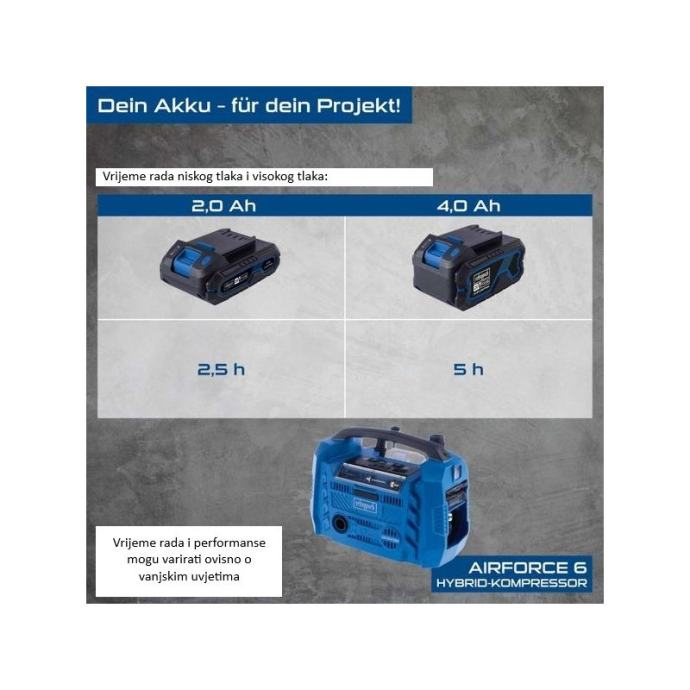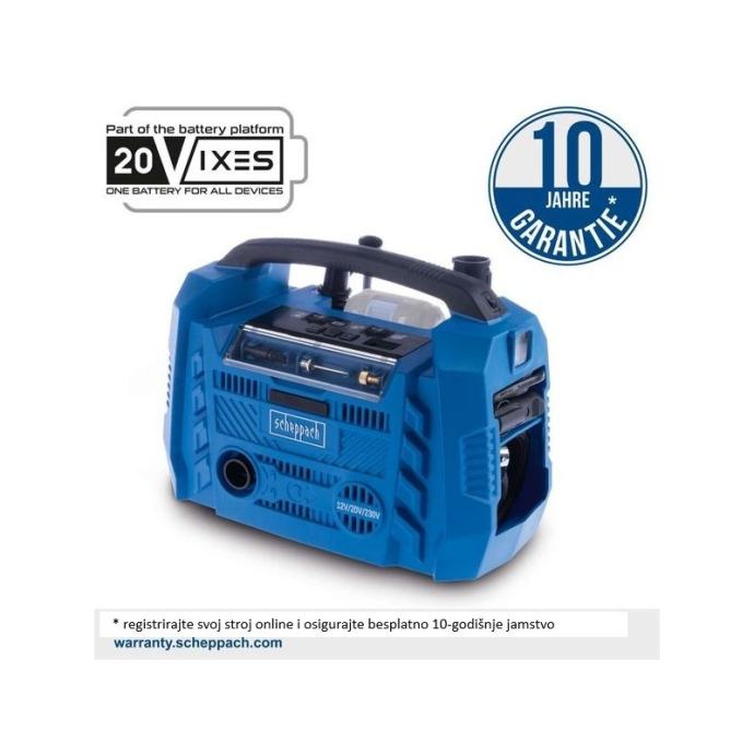 Airforce 6 je mobilni kompresor za napuhavanje guma, lopti i opreme na napuhavanje, s napajanjem preko mreže 230 V / 50 Hz, 12 V priključka u vozilu ili 20 V Li-ion baterijemaksimalni radni tlak je 10,3 bar, a usisni kapacitet 21 l/min. Tlak se podešava preko upravljačke ploče i prati na zaslonuugrađeni LED i USB priključak šire upotrebu u terenu i u voziludimenzije su 292 × 147 × 212 mm, a neto masa 2,3 kg za nošenje u gepeku ili radioniciu kompletu su nastavci za ventil i lopte, konusni adapter za opremu na napuhavanje, visokotlačno crijevo 75 cm i crijevo za puhanje 44 cmbaterija i punjač se vode kao zasebna stavka (ovisno o konfiguraciji kompleta)Tehnički podaci Naziv Hibridni kompresor Model Airforce 6 Maks. radni tlak 10,3 bar Usisni kapacitet 21 l/min Napajanje 230 V / 50 Hz, 12 V u vozilu, 20 V baterija Nazivni napon baterije 20 V Vrsta baterije Litij-ionska Kapacitet baterije 2000 mAh Vrijeme punjenja 60 min Broj ćelija 5 Zaslon Da Ugrađeni LED Da USB priključak Da Maks. brzina 3500 o/min Dimenzije (D × Š × V) 292 × 147 × 212 mm Neto težina 2,3 kg Razina zvučnog tlaka Lp(A) 82,5 dB Razina zvučne snage Lw(A) 92,0 dB Zajamčena zvučna snaga Lw(A) 94,0 dB Najčešća pitanja (Q&A) Koje su opcije napajanja i što znači “hibridni” kompresor u praksi? Ovaj hibridni kompresor podržava 3 načina napajanja: 230 V (mreža), 12 V (utičnica u vozilu) i 20 V bateriju (Li-ion). Operativno: isti uređaj pokriva garažu, put i teren bez improvizacija – birate izvor napajanja prema situaciji. Koliki je maksimalni tlak i je li dovoljan za auto i bicikl gume? Maksimalni radni tlak je 10,3 bar. To je dovoljno za tipične primjene poput automobilskih guma, guma bicikla, lopti i sličnih potrošača – ključ je pravilno postaviti željeni tlak i pratiti ga na zaslonu. Ima li automatsko isključivanje i kako sprječava prekomjerno napuhavanje? Da, kompresor ima automatsko isključivanje nakon postizanja zadane vrijednosti. Operativno: postavite ciljnu vrijednost tlaka na upravljačkoj ploči, kompresor radi do cilja i zatim se sam gasi, što smanjuje rizik prekomjernog napuhavanja i olakšava rad “bez nadzora”. Koliki je protok (usisni kapacitet) i za koje zadatke je realno? Usisni kapacitet je 21,0 l/min. U praksi je to namijenjeno za napuhavanje i kratke zadatke komprimiranog zraka; nije zamjena za radiončki kompresor s kotlom kada trebate kontinuiran rad pneumatskih alata. Koje jedinice tlaka prikazuje zaslon i kako pomaže u praksi? Digitalni zaslon prikazuje tlak i podržava izbor jedinica bar / psi / kPa. Operativno: korisno je kada imate preporuku tlaka izraženu u različitim jedinicama (npr. auto priručnik, kamp oprema, sportski rekviziti). Dolazi li baterija i punjač u paketu? Baterija i punjač se u pravilu prodaju zasebno; uređaj je kompatibilan s 20 V Li-ion sustavom (kapacitet baterije naveden je 2000 mAh, 5 ćelija). Ako već imate 20 V baterije i punjač iz istog sustava, možete ih koristiti i ovdje – provjerite što je točno navedeno u Vašoj ponudi/kompletu. Što dolazi u paketu (nastavci i crijeva) i za koje primjene služe? U paketu su: adapter za ventil, igla za loptu, konusni adapter za rekvizite na napuhavanje, visokotlačno crijevo 75 cm i crijevo za puhanje 44 cm. Operativno: pokriva gume/ventile, lopte i zračne madrace te funkciju puhanja/ispuhivanja na teško dostupnim mjestima. Koliko je bučan i ima li LED svjetlo za rad u mraku? Razina zvučnog tlaka je Lp(A) 82,5 dB, a zvučna snaga Lw(A) 92,0 dB (zajamčeno 94,0 dB). Ugrađeno je LED radno svjetlo, što je praktično kod rada u garaži, prtljažniku ili navečer na terenu. Što uzeti uz hibridni kompresor 10,3 bar za kompletnu mobilnu upotrebu? Najčešće ide zajedno: • Punjač 20 V (ako ga nemate u sustavu) • Baterija 20 V (rezerva za teren i put) • Manometar (kontrolna provjera tlaka) • Komplet za hitni popravak gume (brža intervencija na cesti)Scheppach nudi produženu garanciju 5+5 godina koja potvrđuje vrhunsku kvalitetu njihovih proizvoda. Garancija se odnosi na 20 V akumulatorske alate (baterije i punjači nisu uključeni). Za aktivaciju garancije molimo ispunite sljedeći formular: https://garantie.scheppach.com/hr-HR.]]>