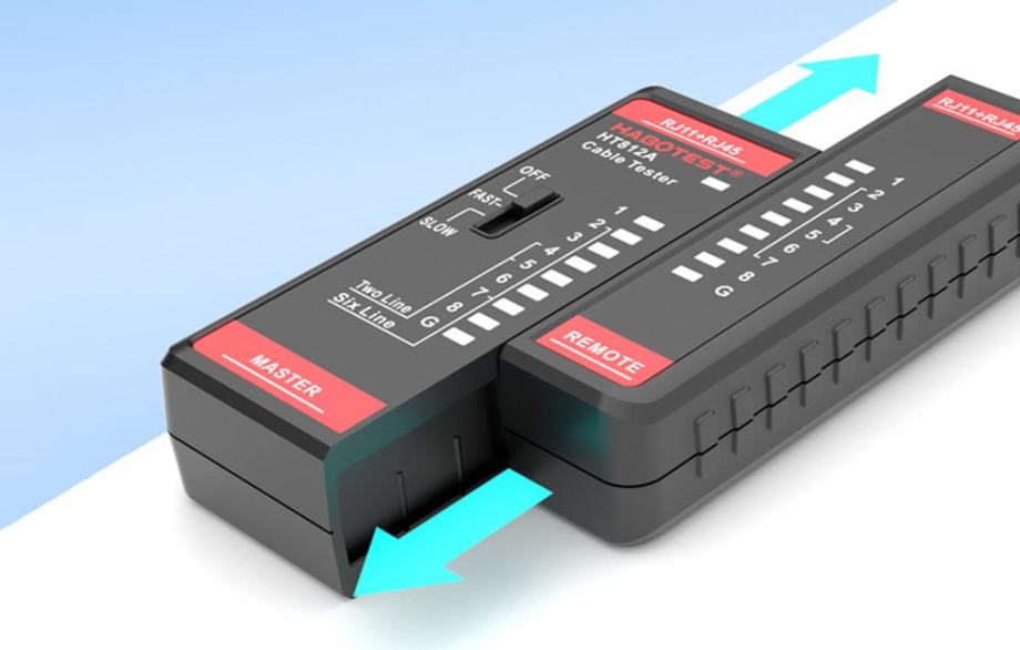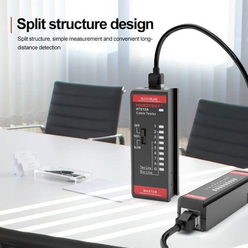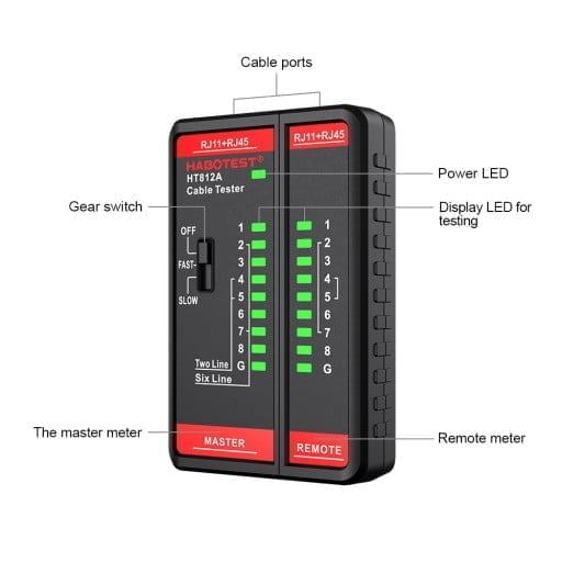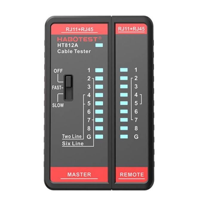 Uz pomoć Habotest HT812A ispitivača kabela, uspješno ćete dobiti informacije o kapacitetu kablova s RJ11 i RJ45 konektorima. Lako ćete provjeriti vrijednosti telefonskih i mrežnih kabela. Uređaj ima kompaktni, sklopivi dizajn. Pokreću ga 2 AAA baterije.