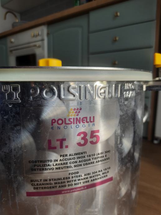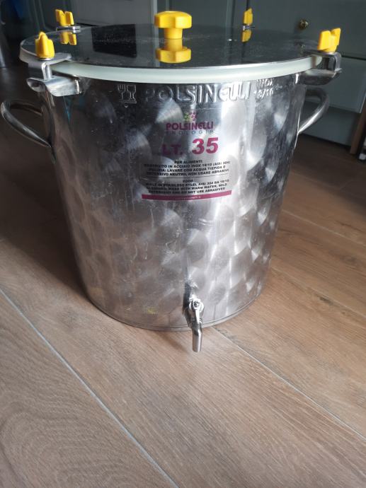 Il fermentatore per birra inox 35 L è progettato per il contenimento e la lavorazione di liquidi alimentari. Costruito interamente in acciaio inox 18/10 (AISI 304) ha una capacità di 35 litri, un diametro di 37 cm e un’altezza pari a 35 cm. Il fermentatore inox 35 L ha uno spessore di pareti e fondo di 0,6 mm, finitura esterna di tipo fiorettato, coperchio ad alto spessore corredato di 4 ganci in inox per la tenuta ermetica e il fondo bombato e saldato, che rende agevoli le operazioni di pulizia del serbatoio. Il dispositivo è dotato di boccola inox filettata per l'applicazione del rubinetto in acciaio inox, rubinetto inox da ½" a 40 mm dal fondo per il deposito dei lieviti, gorgogliatore e guarnizione in silicone alimentare, facilmente removibile e sanificabile per ottenere bevande di qualità elevata. Con l’aggiunta di € 20,00 è possibile aggiungere al serbatoio 2 maniglie in acciaio inox. Su richiesta Polsinelli Enologia realizza fermentatori e impianti per produzione birra di tutte le capacità. Si raccomanda di non utilizzare il fermentatore per Birra Inox 35 L a contatto con una fiamma diretta.