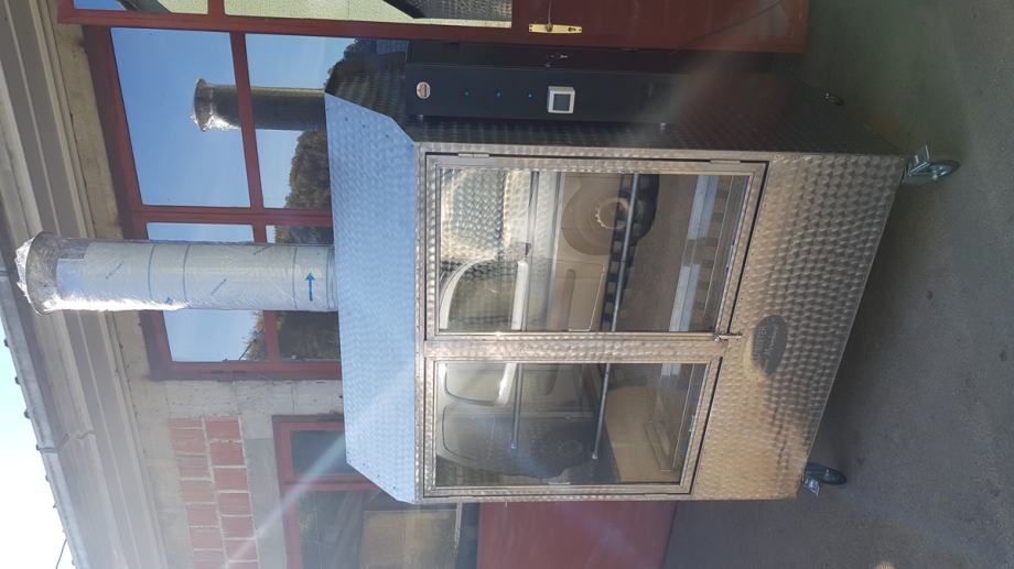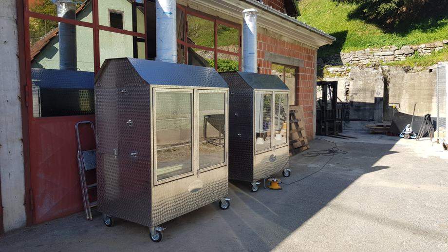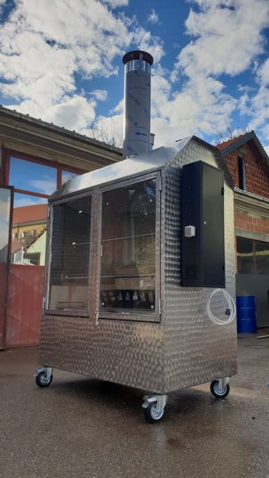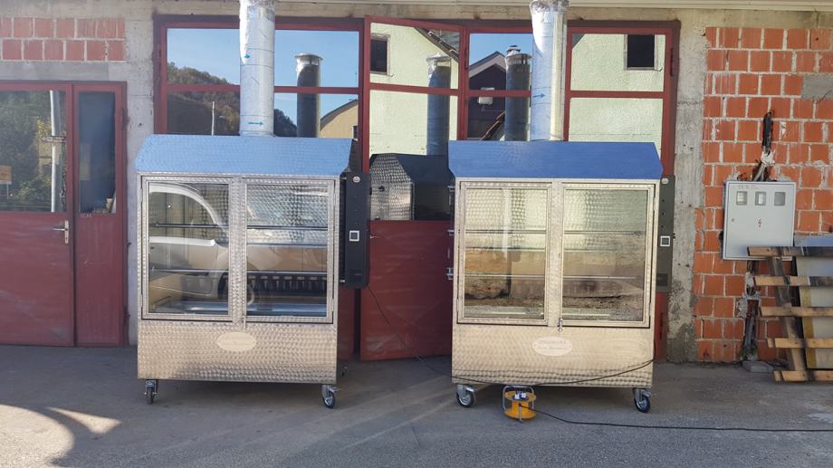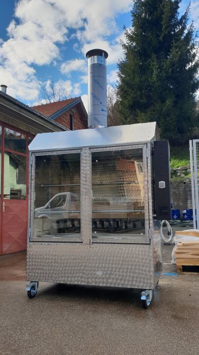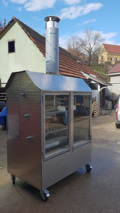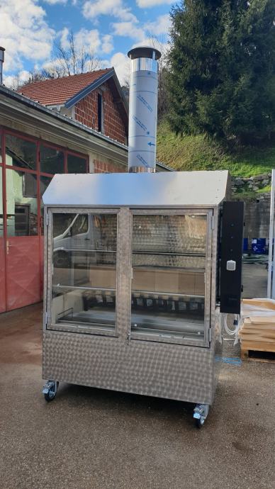 INOX konstrukcija sa staklenim vratima na dva krila. Na 4 kotača. Sa odgovarajućom inox tacnom za skupljanje masti.