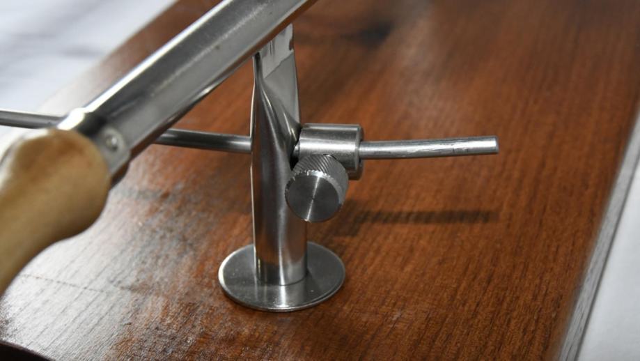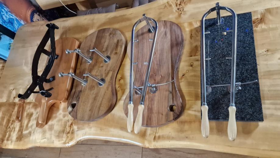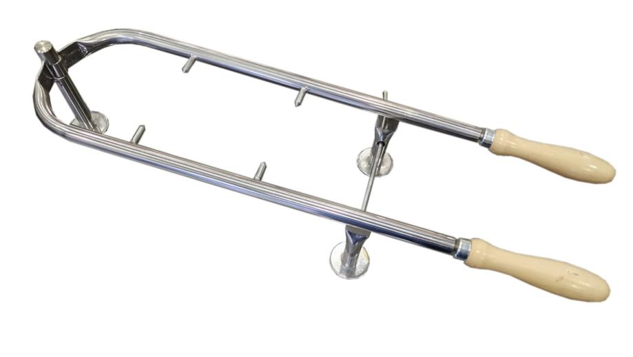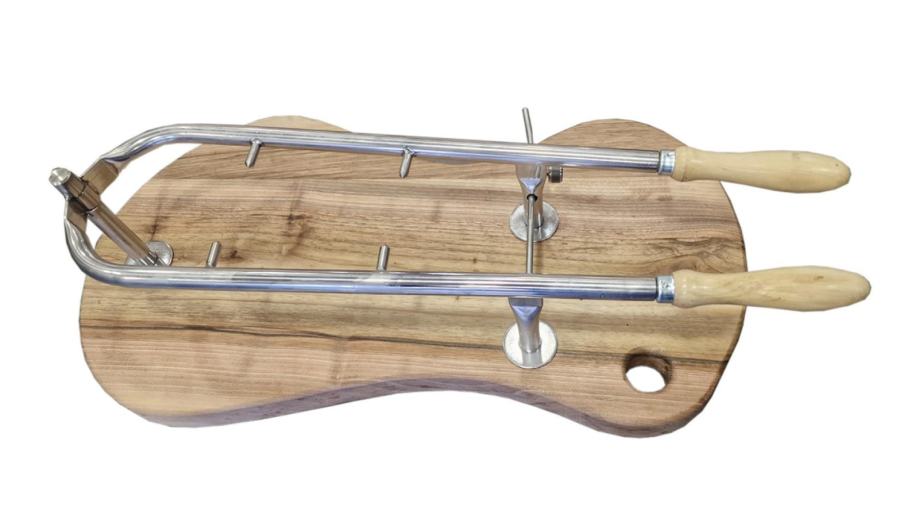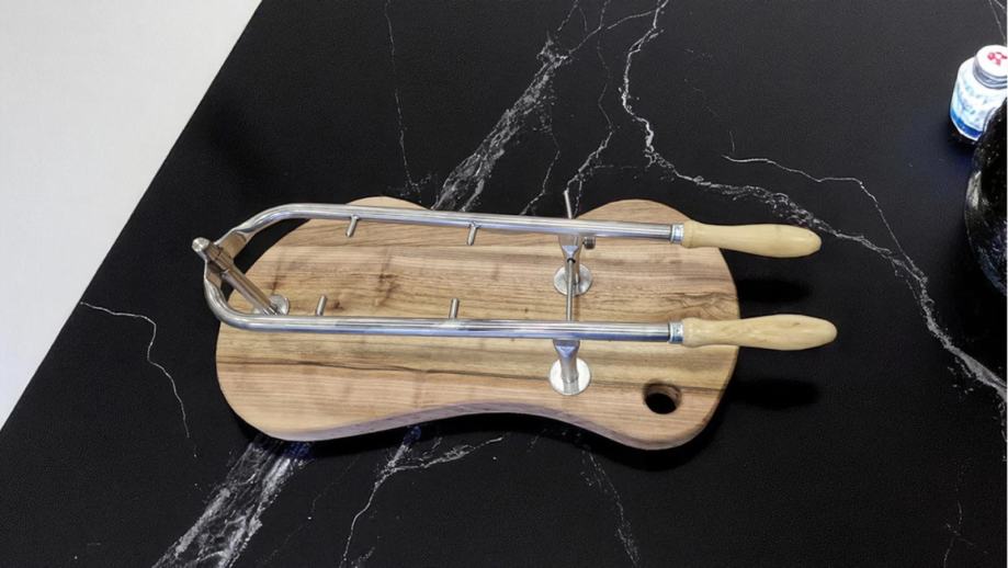 OPIS PROIZVODA: Sastoji se od fiksnog djela koji je fiksiran za stalak potpornom nogom s prednje strane i stupom sa stražnje. Mobilni dio je povezan sa stražnjim stupom sa sistemom za okretanje te sadrži zasebnu nogu kao potporu kod fiksiranja.Novost u ovom proizvodu je jednostavno pričvršćenje kod stiskanja pršuta, tokarenim elementom sa sistemom na navoj.Inox element također sadrži drvene ručke i 2 špice sa svake strane.U ponudi sa dvije vrste stalaka, sa drvenim ili mramornim postoljem:Drveno postolje je pravokutno dimenzija 300x50 mm, debljina drva 4 mm, sa gumenim odbojnicima (nogama) za bolju stabilnost na podlozi.Stalak na drvenom postoljuDimenzije postolja: 300x550Debljina drva: 40 mmVrsta drva: Hrast, Bukva, Trešnja, Orah...Dimenzije pakiranja: 360x660x200 mmTežina stalka: 7 kgUkupna težina = oko 7 kg
